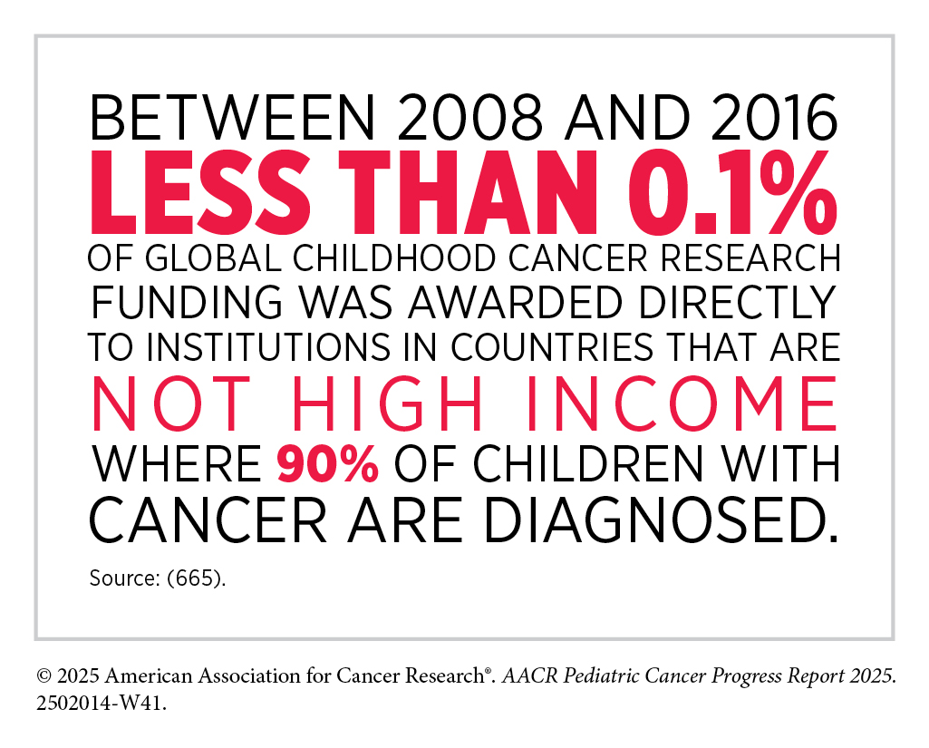 Nearly 90 percent of pediatric cancers occur in LICs, LMICs, and UMICs—yet only 28 percent of pediatric cancer clinical trials are conducted in these regions (653)World Health Organization. Research and development landscape for childhood cancer: a 2023 perspective. Accessed: August 31, 2025.. Although advances in molecular profiling and adaptive clinical trial designs are reshaping childhood and adolescent cancer care, the benefits of these cutting-edge approaches have been felt primarily in HICs. Just 8.7 percent of pediatric clinical trials between 2010 and 2020 were international, and only 5.4 percent were intercontinental (654)de Rojas T, et al. (2021) Cancer Med, 10: 8462..