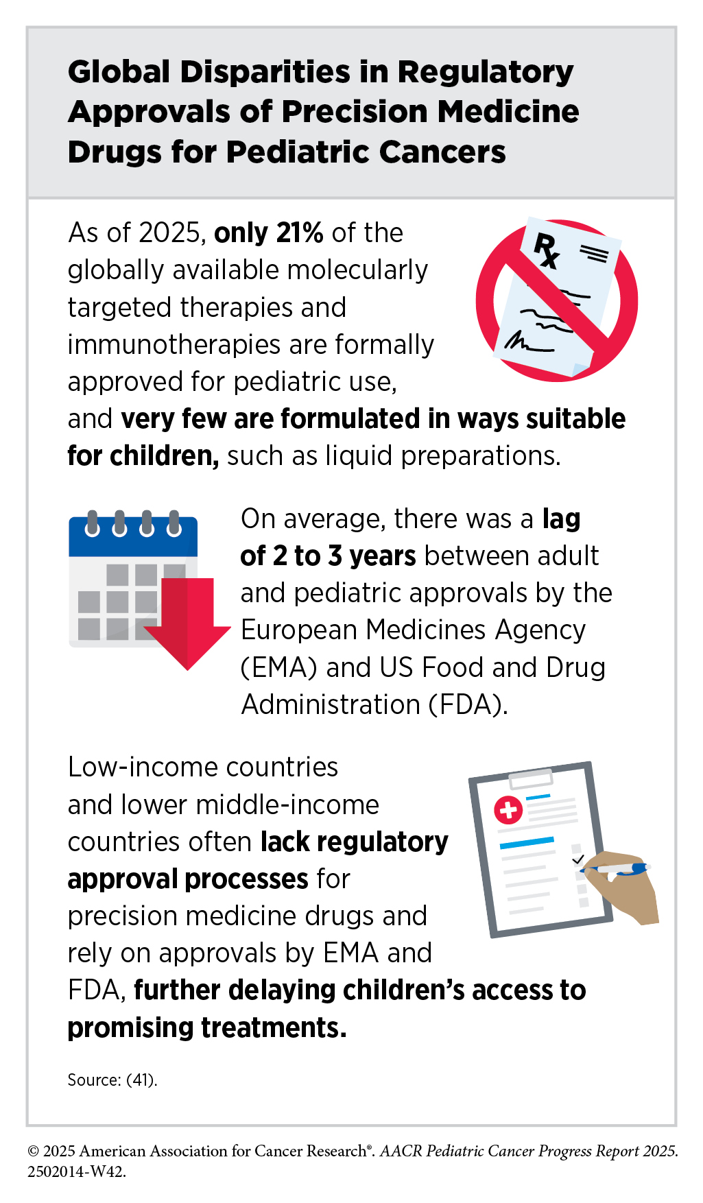 A persistent gap remains between drug approvals for adult and pediatric cancers. This gap stems from scientific challenges such as the rarity of pediatric cancers, regulatory complexities, and practical barriers including limited trial enrollment and scarce resources, all of which delay access of children and adolescents with cancer to promising new therapies that are often available to adults years earlier. In 2020, a cross-region analysis of approvals in the United States, the European Union, and Japan found that, compared to 103 targeted anticancer drugs labeled for adults, only 19 are approved for pediatric cancers, and just three have pediatric indications in all three regions (662)Nishiwaki S, et al. (2020) Sci Rep, 10: 17145.. Policies around the world are beginning to shift the drug development landscape for pediatric cancers by requiring and incentivizing the inclusion of children and adolescents in clinical studies. Continued progress will depend on the outcomes of innovative trials (see Sidebar 23), which are essential to demonstrate safety and efficacy of new therapies in pediatric populations.