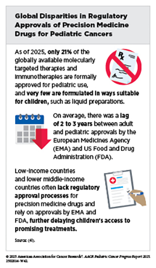 Another source of disparities in access to precision medicine drugs is the lack of rigorous drug approval processes in LICs and LMICs, which largely rely on approvals by EMA and FDA, further delaying access to cutting-edge treatment for children with cancer (41)Cleveland C, et al. (2025) Lancet Child Adolesc Health, 9: 544.(725)Aristizabal P, et al. (2021) Am Soc Clin Oncol Educ Book, 41: e315..