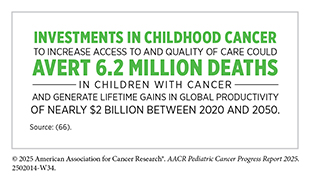 In Africa, the overall survival for childhood cancers is poor, ranging from 30.3 percent in North Africa to 8.1 percent in East Africa (668)van Heerden J, et al. (2020) JCO Glob Oncol, 6: 1264.. A systematic assessment of pediatric oncology clinical trials across 54 African countries found that only 12 percent of trials included children and adolescents, only 50 percent of pediatric trials were interventional, and sub-Saharan countries accounted for only 10.6 percent of pediatric trial activity. Additionally, 14 counties reported having no full-time pediatric oncologists and only two countries had pathology research capabilities, including WGS and molecular pathology for all diseases (668)van Heerden J, et al. (2020) JCO Glob Oncol, 6: 1264.. Africa-focused collaboratives and investments in improving access to diagnostic tools and health care infrastructure will be essential to respond to these challenges and improve outcomes for children in the continent.