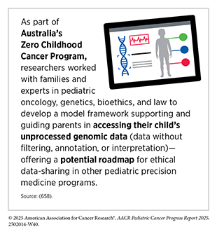 An observational study in the United Kingdom (UK) evaluated whether routine whole-genome sequencing (WGS) (see Sidebar 5) for all children with suspected cancer, not just for high-risk patients, could provide clinical benefit beyond standard of care molecular testing. The study found that across two childhood cancer centers, WGS reproduced all standard tests, modified treatment decisions in 7 percent of cases, and delivered additional diagnostic, risk, therapeutic, or germline genomic findings in 29 percent of cases (268)Hodder A, et al. (2024) Nat Med: s41591..