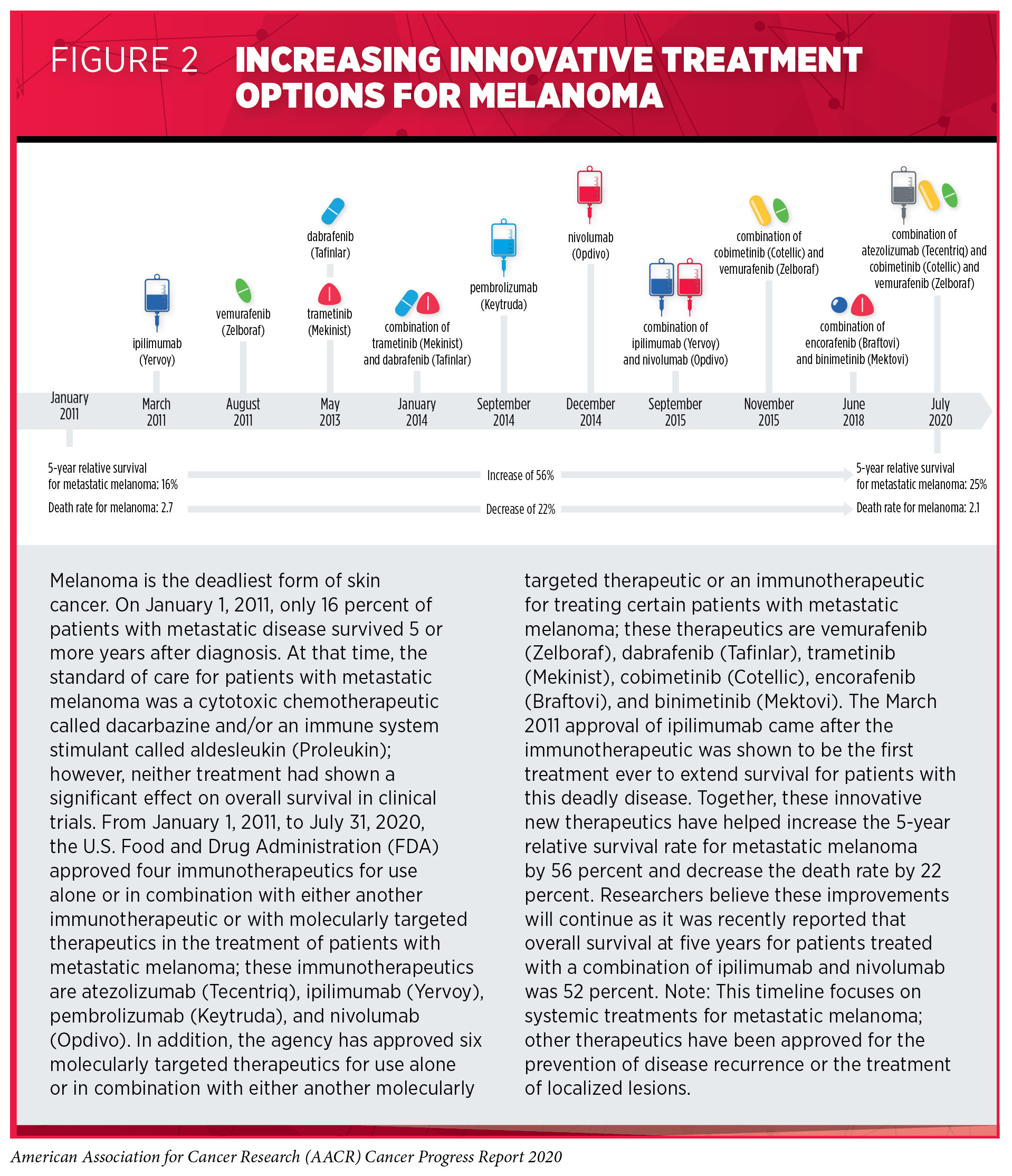 The decline in the U.S. age-adjusted overall cancer death rate has been fueled in large part by a dramatic decline in the lung cancer death rate predominantly as a result of reduced smoking rates (5)Siegel RL, Miller KD, Jemal A. Cancer statistics, 2020. CA Cancer J Clin [Internet]. 2020;. The decline in the lung cancer death rate has accelerated in recent years, falling 2.4 percent each year from 2008 to 2013 and then falling 4.3 percent each year from 2013 to 2017. During the 2013 to 2017 period, the death rate for melanoma, which is the deadliest type of skin cancer, also fell at a remarkable rate of 6.4 percent each year (5)Siegel RL, Miller KD, Jemal A. Cancer statistics, 2020. CA Cancer J Clin [Internet]. 2020;. This striking reduction has been attributed in large part to the innovative new therapeutics approved by the U.S. Food and Drug Administration (FDA) for treating certain patients with the disease since 2011 (see Figure 2)