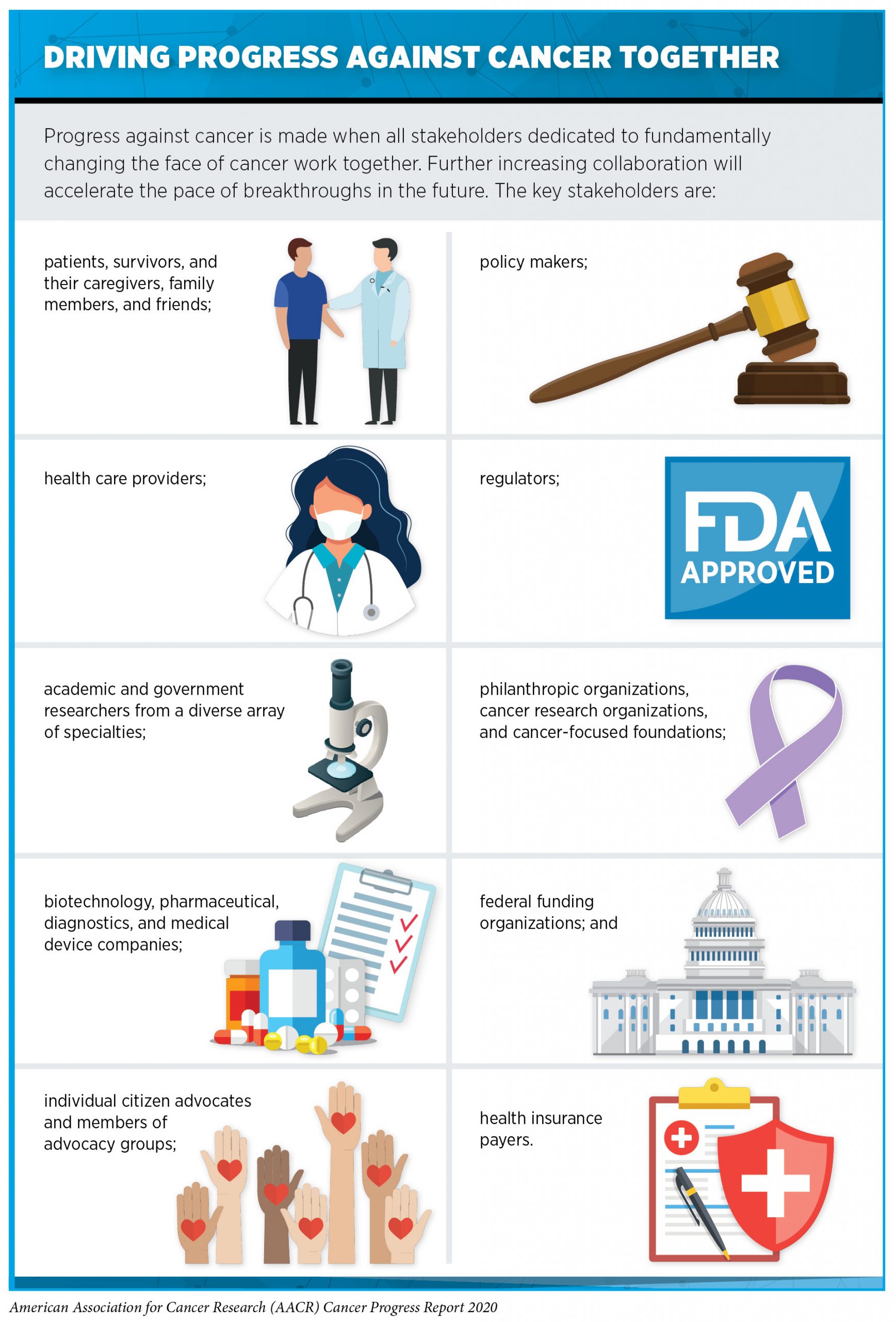 Each advance that spurs progress against cancer is the result of many years of collaboration between different stakeholders dedicated to fundamentally changing the face of this devastating disease (see sidebar on Driving Progress against Cancer Together).