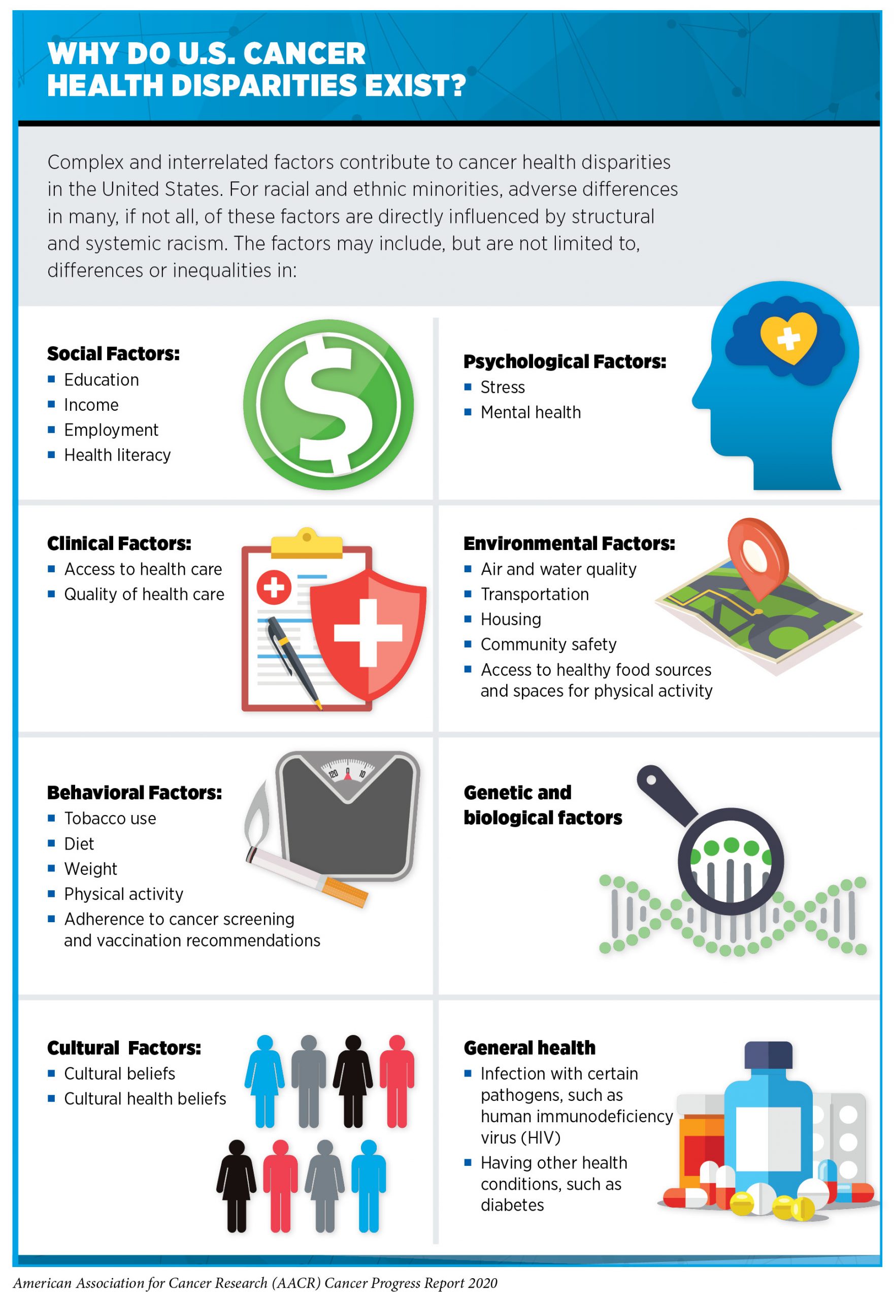 Identifying, quantifying, and understanding the causes of health disparities, including cancer health disparities, is a vital step toward developing and implementing strategies to eliminate these disparities. Current knowledge of the complex and interrelated factors that contribute to cancer health disparities is discussed in detail in the AACR Cancer Disparities Progress Report 2020 (14) (see sidebar on Why Do U.S. Cancer Health Disparities Exist?). For racial and ethnic minorities, adverse differences in many, if not all, of these factors are directly influenced by structural and systemic racism. New insights obtained through research, including basic research using samples from all U.S. population groups, through the participation of individuals from all these groups in clinical trials, and through increased collaboration among all stakeholders will allow us to make major strides toward eliminating cancer for all.