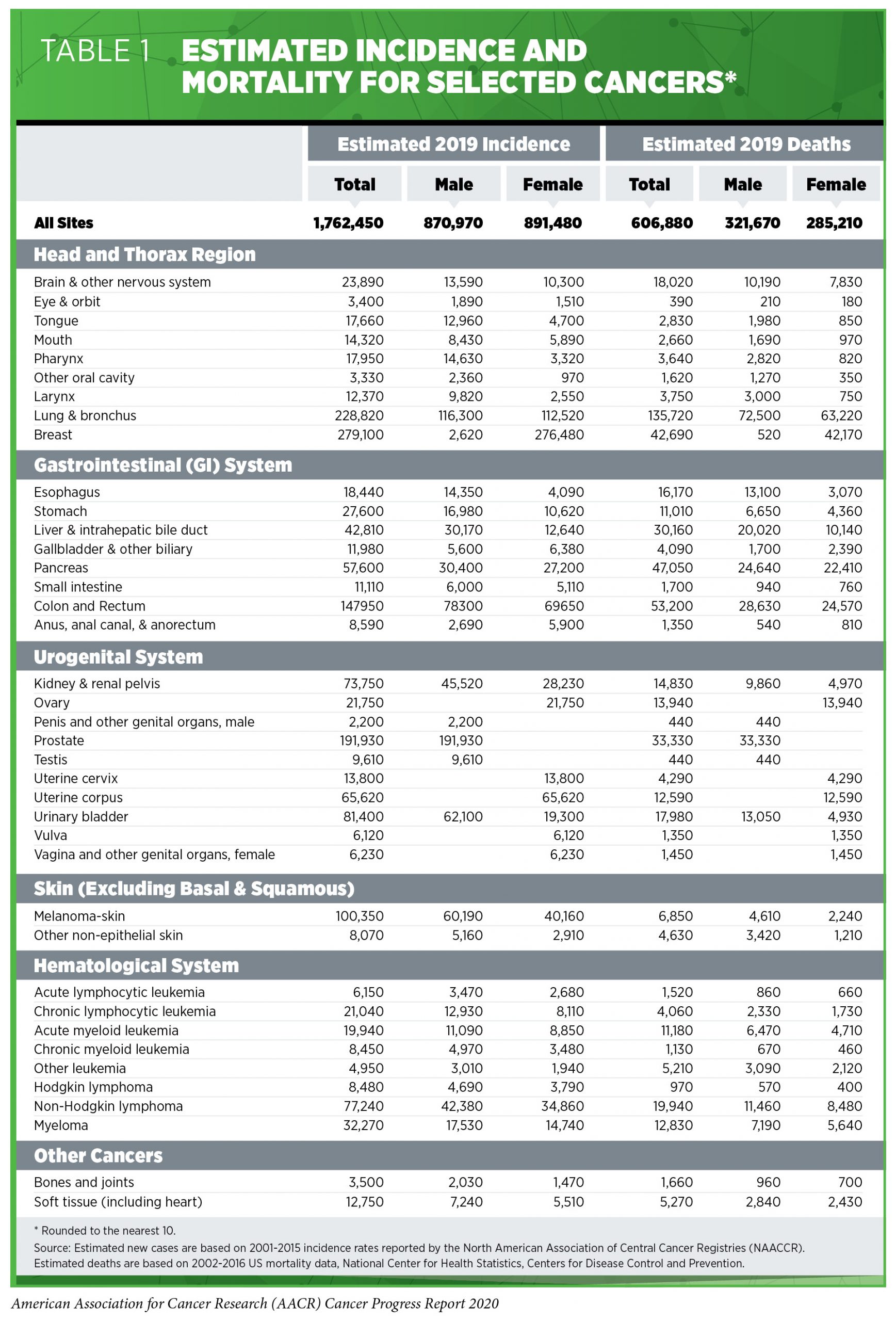 The public health challenge posed by cancer in the United States is illustrated by the fact that researchers project that there will be 1,806,590 new cases of cancer diagnosed in 2020 and that there will be 606,520 deaths from the disease (8) (see Table 1). These numbers translate into 206 new cancer cases and 69 cancer deaths every hour of every day.