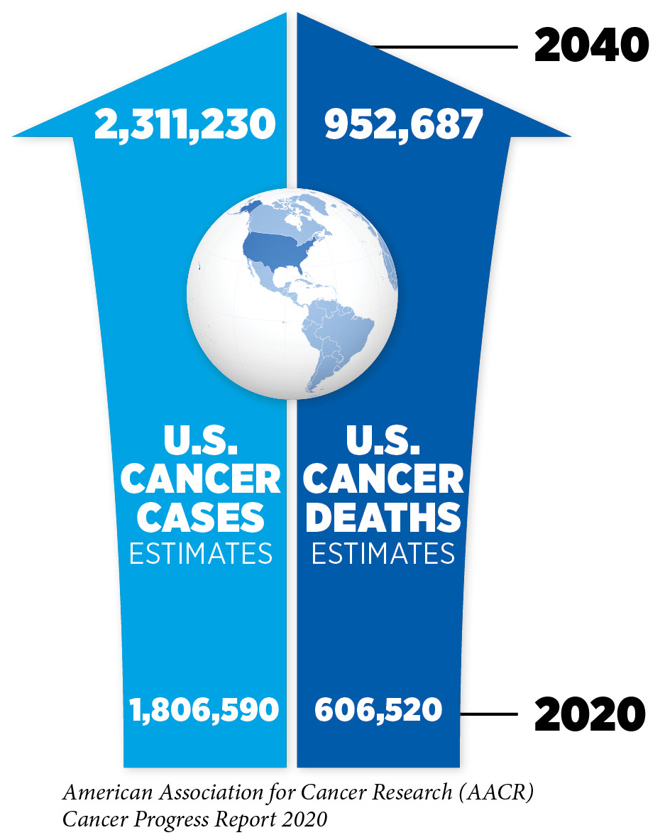 In the United States, it is predicted that the number of new cancer cases and the number of cancer deaths will rise to more than 2.3 million and almost 1 million, respectively, in 2040 (12)Ferlay J, Ervik M, Lam F, Colombet M, Mery L, Piñeros M, Znaor A, Soerjomataram I, Bray F (2018). Global Cancer Observatory: Cancer Tomorrow. Lyon, France: International Agency for Research on Cancer [Internet] [cited 2019 Jul 29].. These sharp increases over the current numbers are anticipated largely because of overall population growth and because the segment of the U.S. population that accounts for most cancer diagnoses—those age 65 and older (2)—is expected to grow from 56 million in 2020 to 81 million in 2040 (22)Bureau UC. 2017 National Population Projections Tables: Main Series. [cited 2020 Jun 30];.