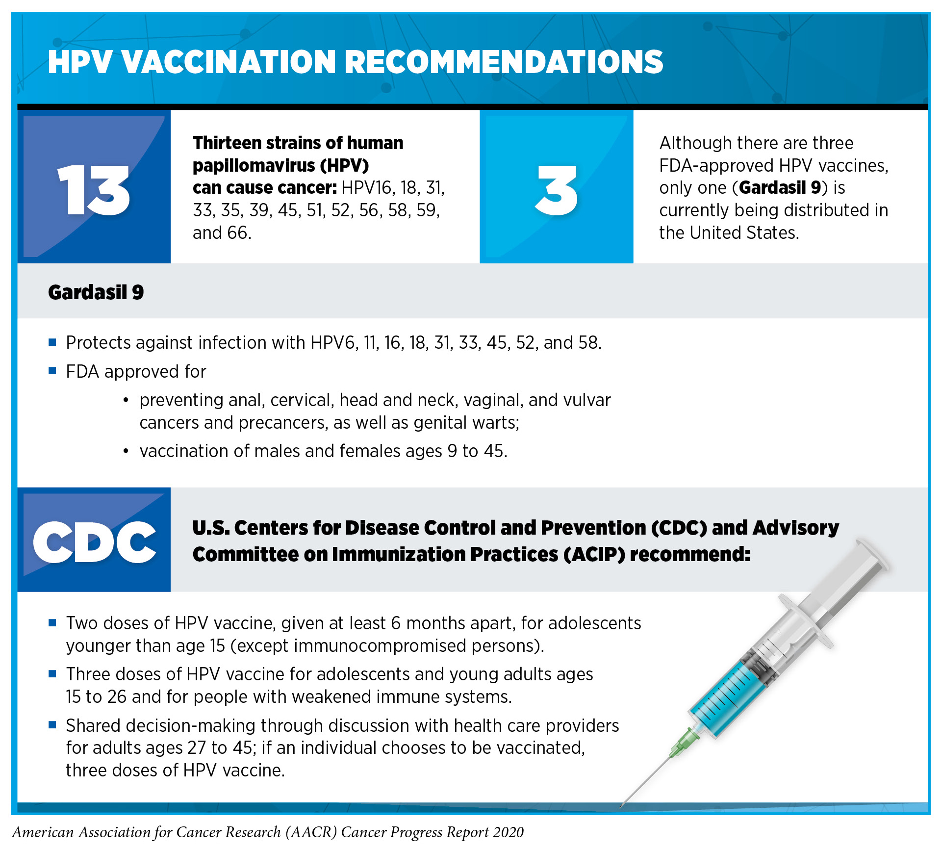 To achieve the greatest benefits to public health, new medicines and technologies must reach all members of society. Public health policies and programs play an important role in supporting equitable access to effective cancer prevention methods such as screening, early treatment, and HPV vaccinations. For example, it is estimated that in the United States, HPV infection accounts for about 34,000 cases of cancer each year, including almost all cases of cervical cancer (see Prevent and Eliminate Infection with Cancer-causing Pathogens). HPV vaccination is recommended for girls and boys ages 11 or 12 (see sidebar on HPV Vaccination Recommendations). Although HPV vaccination rates among U.S. adolescents have risen in recent years, they remain significantly below the national goal of 80 percent set by the U.S. Department of Health and Human Services in Healthy People 2020 (121)Elam-Evans LD, Yankey D, Singleton JA, Sterrett N, Markowitz LE, Williams CL, et al. National, Regional, State, and Selected Local Area Vaccination Coverage Among Adolescents Aged 13–17 Years — United States, 2019. MMWR Morb Mortal Wkly Rep [Internet]. 2020 [cited 2020 Aug 20];69:1109–16.. Therefore, continued funding for screening programs such as CDC’s National Breast and Cervical Cancer Early Detection Program is essential. The elimination of HPV-related cancers in the United States will only be possible through concerted efforts by all stakeholders to enhance public awareness of the importance of cancer prevention and screening, to increase vaccination rates, and to improve screening and treatment of pre-cancerous HPV-related lesions.