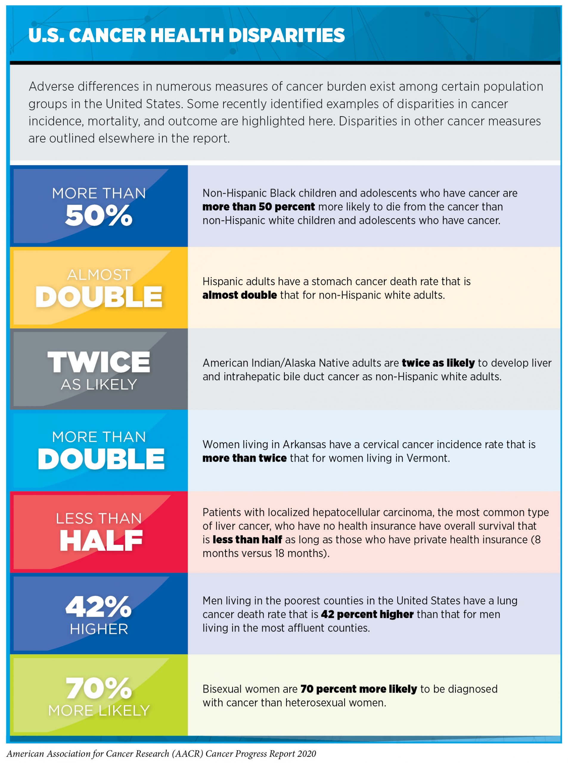 The cancer advocacy and scientific communities continue to work with members of Congress, the NIH, the CDC, and other federal agencies to support and accelerate the elimination of HPV-related cancers in the United States and globally through public policy. Despite advances in cancer research and care, there are persistent disparities in health outcomes for certain segments of the U.S. population, including racial and ethnic minorities, individuals of low socioeconomic status, and residents of rural areas (see sidebars Which U.S. Population Groups Experience Cancer Health Disparities? and U.S. Cancer Health Disparities). Many drivers of cancer health disparities have been identified, and policy solutions are needed to help achieve health equity. State-level vaccination mandates to attend public schools have greatly reduced the incidence of diseases like measles, mumps, and pertussis. Unfortunately, only Hawaii, Rhode Island, Virginia, Puerto Rico, and Washington, DC require HPV vaccination for school attendance. Connecticut and New York are pursuing bills to mandate HPV vaccines in 2020, but further efforts will be needed to achieve the goal of an 80 percent vaccination rate in the United States.