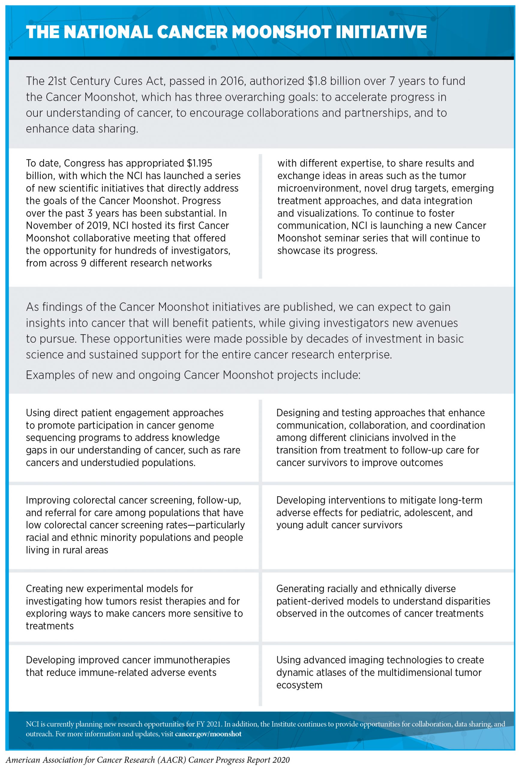 The 21st Century Cures Act, bipartisan legislation passed by Congress in 2016, has also provided funding for the National Cancer Moonshot Initiative through the NIH Innovation Fund (see sidebar on The National Cancer Moonshot Initiative). The National Cancer Moonshot Initiative is accelerating progress against cancer in specific priority areas where there is significant opportunity.