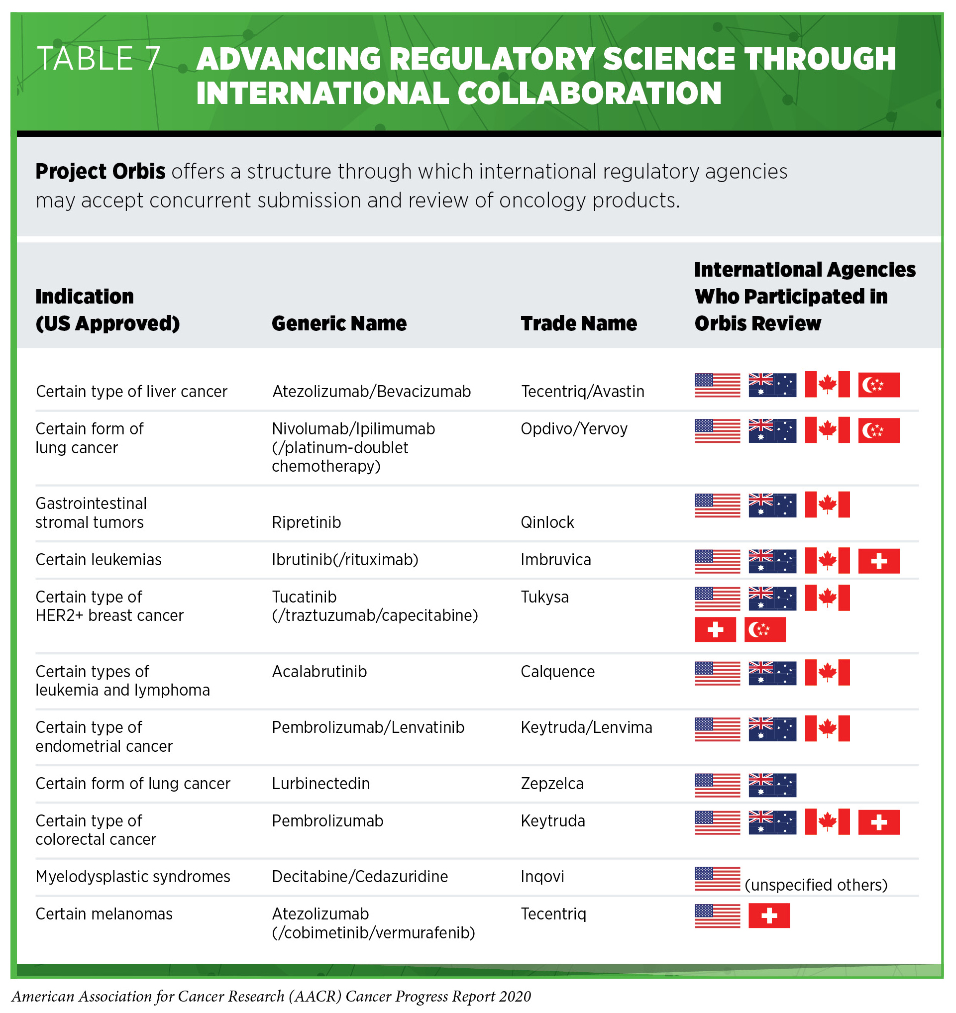 Beyond coordinating the reviews of anticancer therapeutics, the OCE is focused on bringing stakeholders together to discuss, learn, and collaborate with the goal of advancing regulatory science. In September 2019, the OCE announced Project Orbis, a valuable initiative that provides a framework for drug approval applications to be submitted and reviewed concurrently by multiple international regulatory agencies. The FDA oncology products review division has long held regular, confidential teleconferences with other regulatory agencies to exchange information related to applications they are reviewing, and Project Orbis represents an extension of that collaboration to speed global drug review (see Table 7).
