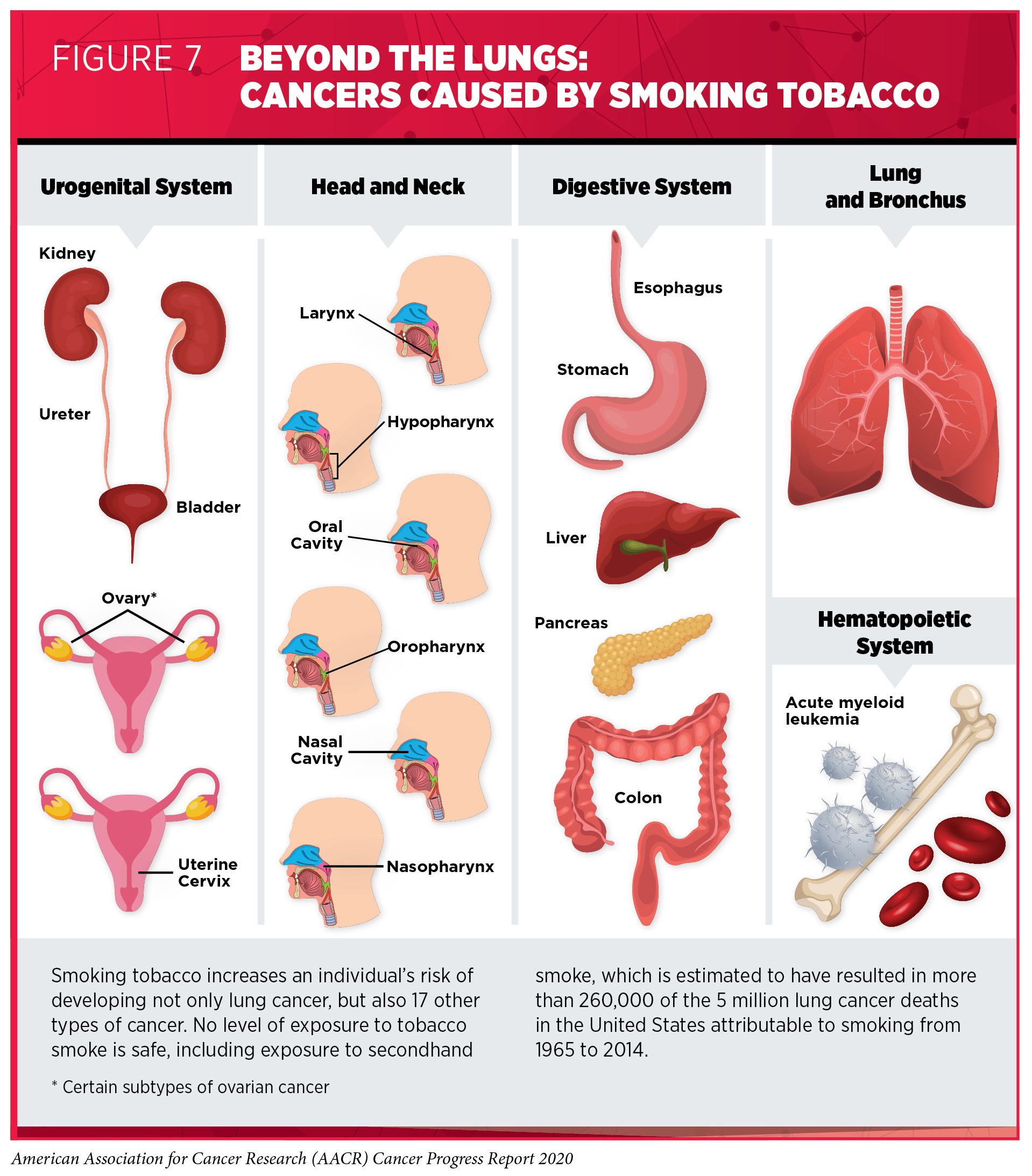Tobacco use is the leading preventable cause of cancer because it exposes individuals to many harmful chemicals that damage DNA, causing genetic and epigenetic alterations that lead to cancer development (122)Barrow TM, Klett H, Toth R, Böhm J, Gigic B, Habermann N, et al. Smoking is associated with hypermethylation of the APC 1A promoter in colorectal cancer: the ColoCare Study. J Pathol [Internet]. 2017 [cited 2018 Mar 15];243:366–75.(123)Vaz M, Hwang SY, Kagiampakis I, Phallen J, Patil A, O’Hagan HM, et al. Chronic Cigarette Smoke-Induced Epigenomic Changes Precede Sensitization of Bronchial Epithelial Cells to Single-Step Transformation by KRAS Mutations. Cancer Cell [Internet]. 2017 [cited 2018 Mar 15];32:360-376.e6.(124). Smoking tobacco has been shown to increase the risk of developing 17 different types of cancer in addition to lung cancer (see Figure 7). Fortunately, quitting at any age can reduce these risks. Researchers have found that quitting smoking allows new, healthy cells to actively replenish the damaged cells in the lining of our airways leading to a protective effect against lung cancer (125)Yoshida K, Gowers KHC, Lee-Six H, Chandrasekharan DP, Coorens T, Maughan EF, et al. Tobacco smoking and somatic mutations in human bronchial epithelium. Nature [Internet]. Nature Publishing Group; 2020 [cited 2020 Jun 30];578:266–72.. According to a recent report from the U.S. Surgeon General, smoking cessation reduces risk for many adverse health effects in addition to reducing risks from cancer, including cardiovascular diseases and chronic obstructive pulmonary disease (COPD) among others (126). In fact, quitting smoking can reduce the risk of premature death and add up to a decade to life expectancy. In addition to its health benefits, smoking cessation can also reduce the substantial financial burden on smokers and the health care system.