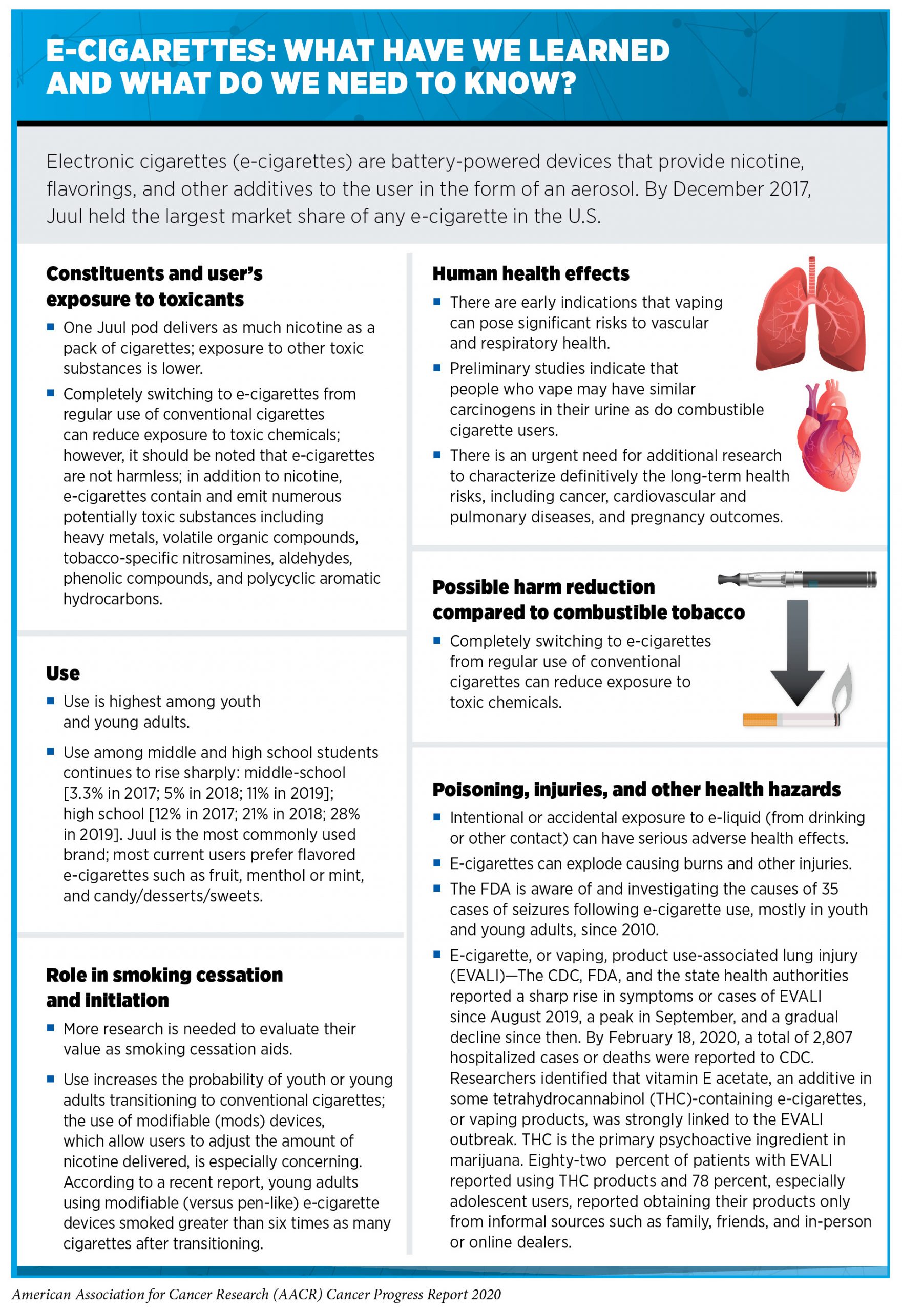 The availability of kid-friendly flavors, exposure to product marketing, and misperceptions about harm are some of the reasons behind the continued use of e-cigarettes among youth and young adults. In fact, according to a 2019 national survey, 20 percent of young adults in the U.S. perceived e-cigarettes as “harmless” (158). While a more recent survey from the U.K. suggests an increase in the proportion of adults age 16 and older who perceive e-cigarettes as harmful, post–EVALI outbreak, whether the same holds true in the U.S. and whether such change in perception leads to a long-term change in e-cigarette use among youth and young adults remains to be evaluated (159)Tattan-Birch H, Brown J, Shahab L, Jackson SE. Association of the US Outbreak of Vaping-Associated Lung Injury With Perceived Harm of e-Cigarettes Compared With Cigarettes. JAMA Netw Open [Internet]. American Medical Association; 2020 [cited 2020 Jun 30];3:e206981..