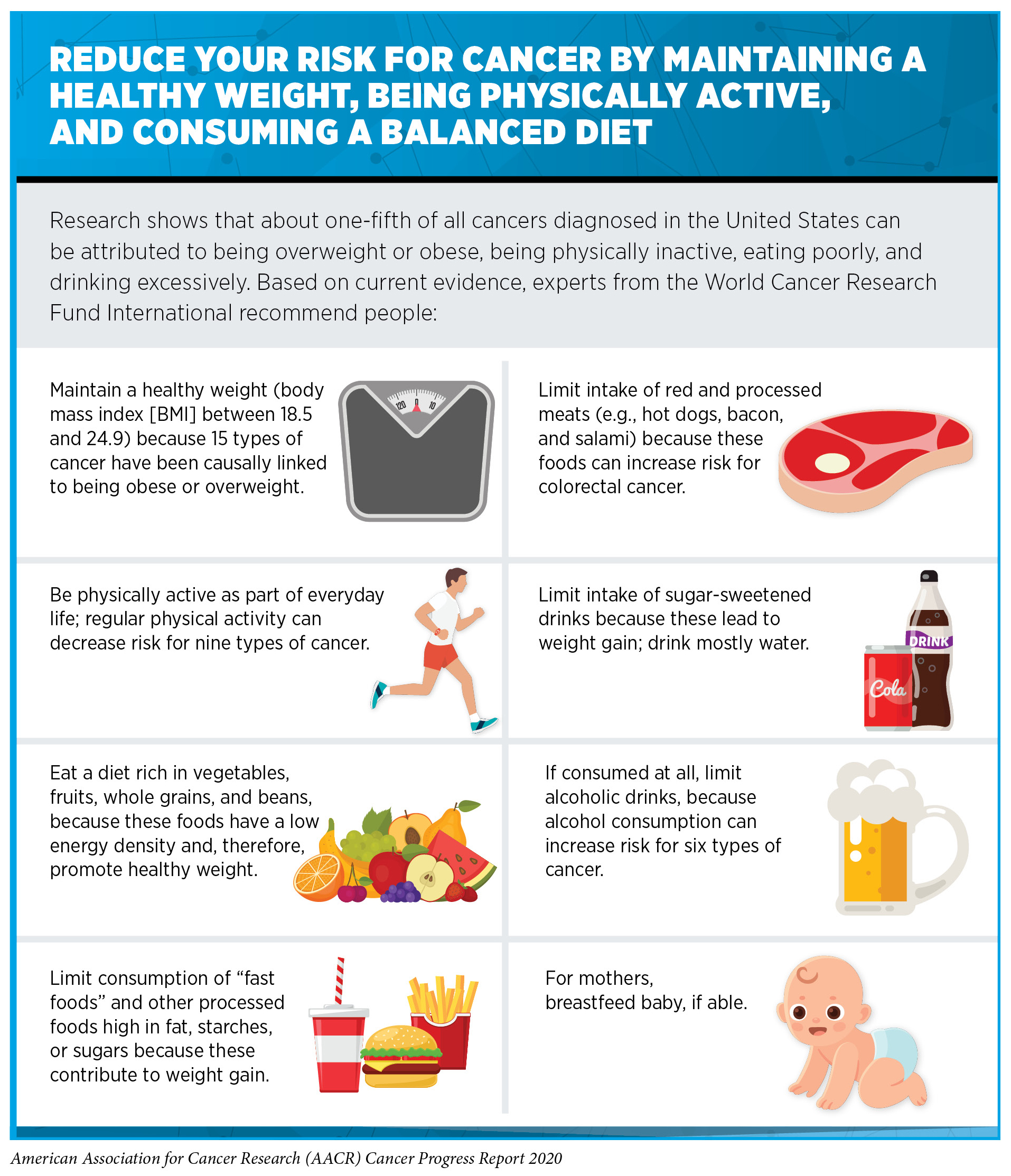 Nearly 20 percent of new cancer cases and 16 percent of cancer deaths in U.S. adults are attributable to a combination of being overweight or obese, poor diet, physical inactivity, and excessive alcohol consumption (110)Islami F, Sauer AG, Miller KD, Siegel RL, Fedewa SA, Jacobs EJ, et al. Proportion and number of cancer cases and deaths attributable to potentially modifiable risk factors in the United States. CA Cancer J Clin [Internet]. 2017;68:31–54.. Being overweight or obese as an adult increases a person’s risk for 15 types of cancer whereas being physically active reduces risk for nine types of cancer (see Figure 8). Therefore, maintaining a healthy weight, being physically active, avoiding sedentary behavior, and consuming a balanced diet are effective ways a person can lower the risk of developing or dying from cancer (see sidebar on Reduce Your Risk for Cancer by Maintaining a Healthy Weight, Being Physically Active, and Consuming a Balanced Diet). Identifying the ways by which obesity, unhealthy diet, and physical inactivity increase cancer risk and quantifying the magnitude of such risks are areas of active research investigation (161)Mariosa D, Carreras-Torres R, Martin RM, Johansson M, Brennan P. Commentary: What can Mendelian randomization tell us about causes of cancer? Int J Epidemiol [Internet]. Oxford Academic; 2019 [cited 2020 Jul 1];48:816–21..