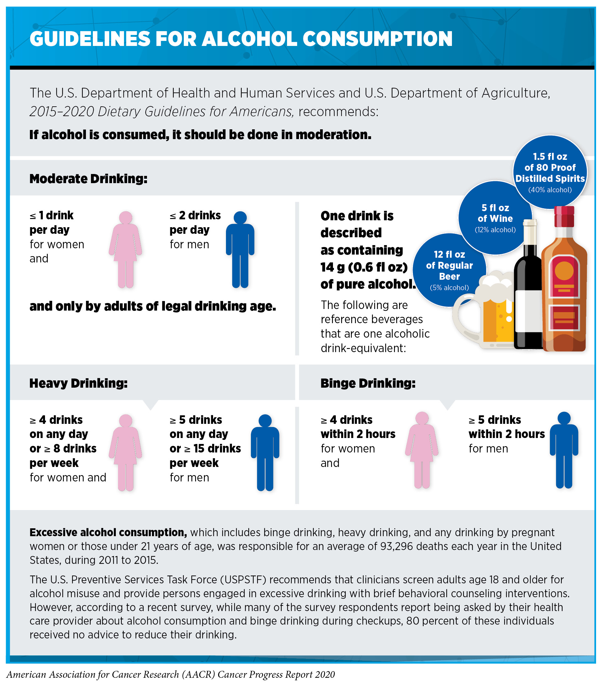 Drinking alcohol increases the risk for six different types of cancer (198) (see Figure 9). Even modest use of alcohol may increase cancer risk, but the greatest risks are associated with excessive and/or long-term consumption (199)Xi B, Veeranki SP, Zhao M, Ma C, Yan Y, Mi J. Relationship of Alcohol Consumption to All-Cause, Cardiovascular, and Cancer-Related Mortality in U.S. Adults. J Am Coll Cardiol [Internet]. Elsevier; 2017 [cited 2018 Apr 3];70:913–22.(200)White AJ, DeRoo LA, Weinberg CR, Sandler DP. Lifetime Alcohol Intake, Binge Drinking Behaviors, and Breast Cancer Risk. Am J Epidemiol [Internet]. Oxford University Press; 2017 [cited 2018 May 7];186:541–9.(201)LoConte NK, Brewster AM, Kaur JS, Merrill JK, Alberg AJ. Alcohol and Cancer: A Statement of the American Society of Clinical Oncology. J Clin Oncol [Internet]. 2018 [cited 2018 May 3];36:83–93.(202)Hydes TJ, Burton R, Inskip H, Bellis MA, Sheron N. A comparison of gender-linked population cancer risks between alcohol and tobacco: how many cigarettes are there in a bottle of wine? BMC Public Health [Internet]. BioMed Central; 2019 [cited 2019 May 10];19:316.(see sidebar on Guidelines for Alcohol Consumption). Researchers have identified multiple ways in which alcohol may increase the risk of cancer, including directly damaging cellular DNA and proteins through the production of toxic chemicals, once alcohol is metabolized after drinking (203). Alcohol can also increase levels of estrogen and other hormones that are associated with breast cancer (204). Several reports indicate that the use of alcohol has been rising in the U.S. in recent years (205)Alcohol Consumption | Cancer Trends Progress Report [Internet]. [cited 2020 Jul 1]. (206)(207)Han BH, Moore AA, Ferris R, Palamar JJ. Binge Drinking Among Older Adults in the United States, 2015 to 2017. J Am Geriatr Soc [Internet]. John Wiley & Sons, Ltd; 2019 [cited 2020 Mar 16];67:2139–44.. Concurrent with increases in consumption, rates of alcohol-related deaths have also increased at an alarming rate (208)(209)S S, MS S, AF B, EA H, DR W, Y C, et al. Trends in Alcohol-Induced Deaths in the United States, 2000-2016. JAMA Netw open [Internet]. JAMA Netw Open; 2020 [cited 2020 Jul 1];3..
