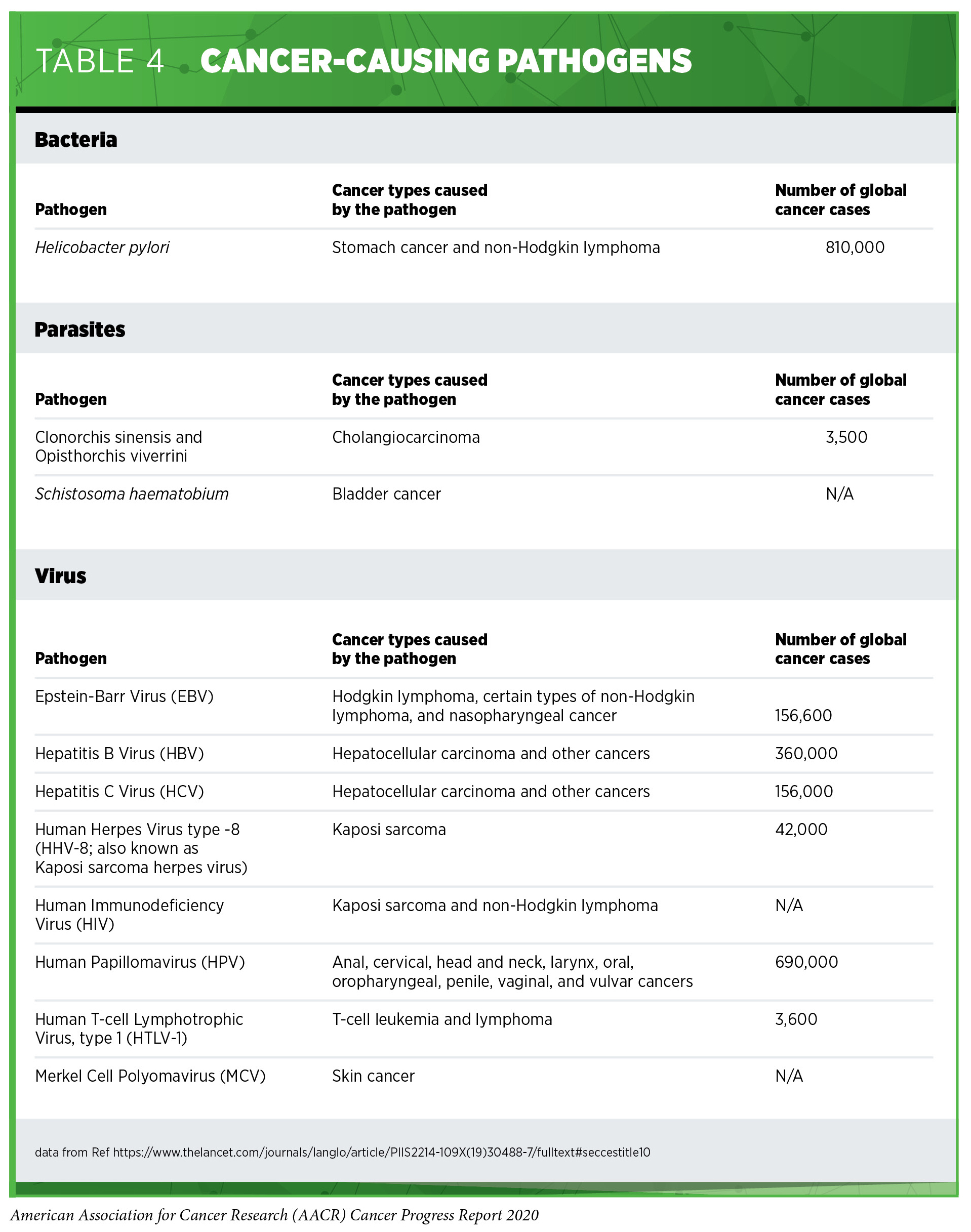 Persistent infection with several pathogens—bacteria, viruses, and parasites that cause disease—increases a person’s risk for several types of cancer (see Table 4). The primary causes of infection-attributable cancers are human papillomavirus (HPV), hepatitis B virus (HBV), hepatitis C virus (HCV), and Helicobacter pylori (110)Islami F, Sauer AG, Miller KD, Siegel RL, Fedewa SA, Jacobs EJ, et al. Proportion and number of cancer cases and deaths attributable to potentially modifiable risk factors in the United States. CA Cancer J Clin [Internet]. 2017;68:31–54.(226)de Martel C, Georges D, Bray F, Ferlay J, Clifford GM, Martel C de, et al. Global burden of cancer attributable to infections in 2018: a worldwide incidence analysis. Lancet Glob Heal [Internet]. International Agency for Research on Cancer; 2020 [cited 2020 Jul 1];8:e180–90.(227)Hong CY, Sinn DH, Kang D, Paik SW, Guallar E, Cho J, et al. Incidence of extrahepatic cancers among individuals with chronic hepatitis B or C virus infection: A nationwide cohort study. J Viral Hepat [Internet]. John Wiley & Sons, Ltd; 2020 [cited 2020 Aug 6];jvh.13304.. In the United States, about 3 percent of all cancer cases are attributable to infection with pathogens while globally, an estimated 13 percent of all cancer cases are attributable to infections (110)Islami F, Sauer AG, Miller KD, Siegel RL, Fedewa SA, Jacobs EJ, et al. Proportion and number of cancer cases and deaths attributable to potentially modifiable risk factors in the United States. CA Cancer J Clin [Internet]. 2017;68:31–54.(226)de Martel C, Georges D, Bray F, Ferlay J, Clifford GM, Martel C de, et al. Global burden of cancer attributable to infections in 2018: a worldwide incidence analysis. Lancet Glob Heal [Internet]. International Agency for Research on Cancer; 2020 [cited 2020 Jul 1];8:e180–90.. Individuals can significantly lower their risks by protecting themselves from infection or by obtaining treatment, if available, to eliminate an infection (see sidebar on Preventing or Eliminating Infection with the Four Main Cancer-causing Pathogens). It is important to note that even though strategies to eliminate, treat, or prevent infection with Helicobacter pylori, HBV, HCV, and HPV can significantly lower an individual’s risks for developing cancers, these strategies are not effective at treating infection-related cancers once they develop.