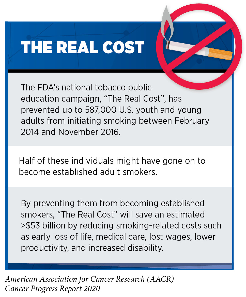 It is imperative that all stakeholders continue to work together to identify evidence-based, population-level interventions such as tobacco price increases, public health campaigns, age and marketing restrictions, cessation counseling and medications, and smoke-free laws to reduce smoking rates and smoking-related cancer burden in the United States. Two recent reports indicate that innovative interventions offered in unique clinical settings, such as the Emergency Department while patients present with semi-urgent or non-urgent treatments, or at pediatricians’ offices while parents are visiting with their child’s doctor, can be effective in increasing smoking cessation among adults (133)WHC L, KY H, MP W, DYT C, KKW L, W X, et al. Effectiveness of a Brief Self-determination Theory-Based Smoking Cessation Intervention for Smokers at Emergency Departments in Hong Kong: A Randomized Clinical Trial. JAMA Intern Med [Internet]. JAMA Intern Med; 2019 [cited 2020 Jun 30];180.(134)E N-B, JE D, B HW, NA R, DJ O, DE L, et al. Treating Parents for Tobacco Use in the Pediatric Setting: The Clinical Effort Against Secondhand Smoke Exposure Cluster Randomized Clinical Trial. JAMA Pediatr [Internet]. JAMA Pediatr; 2019 [cited 2020 Jun 30];173.. These findings are important since each year over half of adult smokers try to quit smoking but less than 10 percent are successful (126). Notably, FDA-approved therapeutics and behavioral counseling have both been shown to improve the chances of quitting and using them together can double the odds of quitting successfully (126).