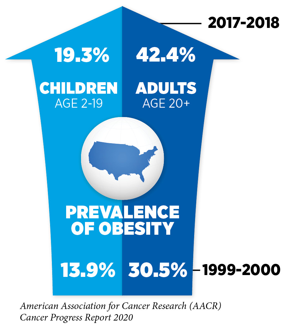 In 2014, an estimated seven and eight percent of all U.S. cancer cases and deaths, respectively, were attributable to excess body weight. Beyond cancer, obesity increases the risk of developing several other health problems including type 2 diabetes, high blood pressure, heart disease, stroke, liver disease, and kidney disease (169)Harrison R. The State of Obesity: 2019. 1905;10:1055.. Therefore, it is concerning that in the U.S. and around the globe the prevalence of obesity has been rising steadily. In the United States, 42 percent of adults age 20 and older were obese in 2018, and according to a recent projection, by the year 2030, nearly 50 percent of all U.S. adults age 18 and older will have obesity (117)Craig M. Hales, M.D., Margaret D. Carroll, M.S.P.H., Cheryl D. Fryar, M.S.P.H., and Cynthia L. Ogden PD. Prevalence of Obesity and Severe Obesity Among Adults: United States, 2017–2018. NCHS Data Brief [Internet]. 2020;1–8.(170)Ward ZJ, Bleich SN, Cradock AL, Barrett JL, Giles CM, Flax C, et al. Projected U.S. State-Level Prevalence of Adult Obesity and Severe Obesity. N Engl J Med [Internet]. Massachusetts Medical Society; 2019 [cited 2020 Jul 1];381:2440–50.. An area of particular concern is childhood obesity, since for many children excess body weight extends into adulthood and increases the risk of adverse health outcomes (171)Geserick M, Vogel M, Gausche R, Lipek T, Spielau U, Keller E, et al. Acceleration of BMI in Early Childhood and Risk of Sustained Obesity. N Engl J Med [Internet]. Massachusetts Medical Society; 2018 [cited 2019 May 28];379:1303–12.(172)Levi Z, Rottenberg Y, Twig G, Katz L, Leiba A, Derazne E, et al. Adolescent overweight and obesity and the risk for pancreatic cancer among men and women: a nationwide study of 1.79 million Israeli adolescents. Cancer [Internet]. John Wiley & Sons, Ltd; 2019 [cited 2019 May 28];125:118–26.(173)Ward ZJ, Long MW, Resch SC, Giles CM, Cradock AL, Gortmaker SL, et al. Simulation of Growth Trajectories of Childhood Obesity into Adulthood. N Engl J Med [Internet]. 2017;377:2145–53.. In 2018, nearly 20 percent of children ages 2 to 19 years were obese (174). Concurrent with the steady rise in obesity rates in the United States, the incidence of several obesity-associated cancers has also been rising at an alarming rate, especially among young adults (175)(176)Sung H, Siegel RL, Rosenberg PS, Jemal A. Emerging cancer trends among young adults in the USA: analysis of a population-based cancer registry. Lancet Public Heal [Internet]. The Author(s). Published by Elsevier Ltd. This is an Open Access article under the CC BY 4.0 license; 2019;0:1–11.. While further research is needed to elucidate whether weight loss can effectively mitigate cancer risks and curb these emerging trends, intervention to reduce obesity is certainly a top priority in public health.
