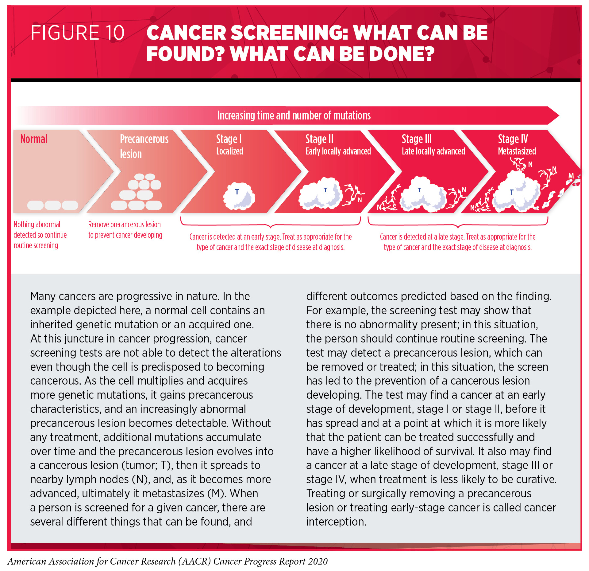 Screening for cancer means checking for precancerous lesions or cancer in people who have no signs or symptoms of the cancer for which they are being checked. The aim is to find an abnormality at the earliest possible time in cancer development. If a cancer screening test shows a precancerous lesion is present, it can be treated or surgically removed before becoming cancer (see Figure 10). If a test finds a cancer at an early stage of development, stage I or stage II, before it has spread, it is more likely that the patient can be treated successfully; for example, patients diagnosed with colorectal cancer or breast cancer when the cancer is confined to the colon or rectum, or to the breast, have 5-year relative survival rates of 90 percent and 99 percent, respectively, while those diagnosed with colorectal cancer or breast cancer that has metastasized have 5-year relative survival rates of 14 percent and 28 percent, respectively (2)Howlader N, Noone AM, Krapcho M, Miller D, Brest A, Yu M, Ruhl J, Tatalovich Z, Mariotto A, Lewis DR, Chen HS, Feuer EJ, Cronin KA (eds). SEER Cancer Statistics Review, 1975-2017, National Cancer Institute. Bethesda, MD, https://seer.cancer.gov/csr/1975_2 [Internet]. [cited 2020 Jun 29].. Treating or surgically removing a precancerous lesion or early-stage cancer is called cancer interception.