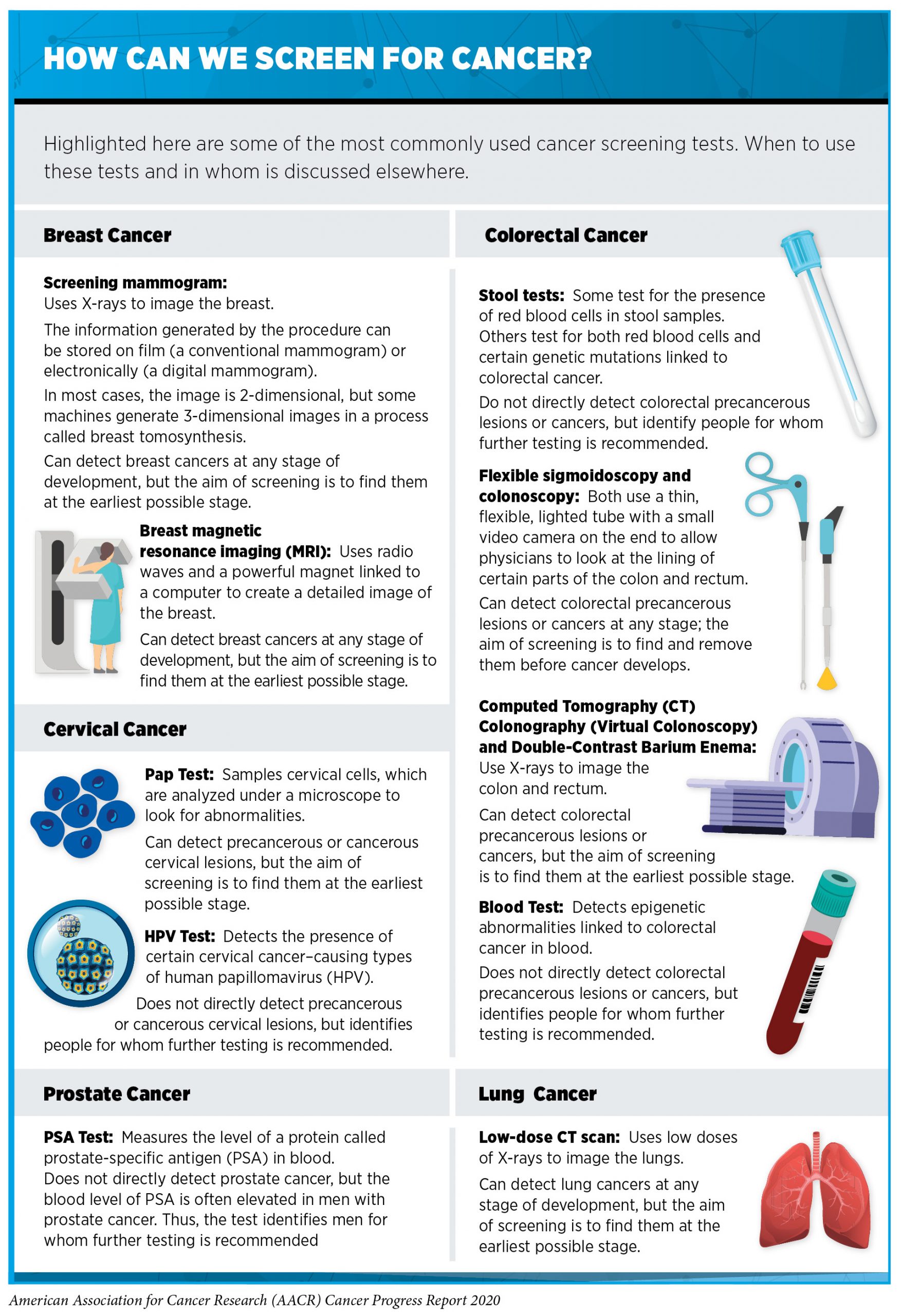 - There are five types of cancer (breast, cervical, colorectal, lung, and prostate) for which screening tests have been used to screen large segments of the U.S. population.