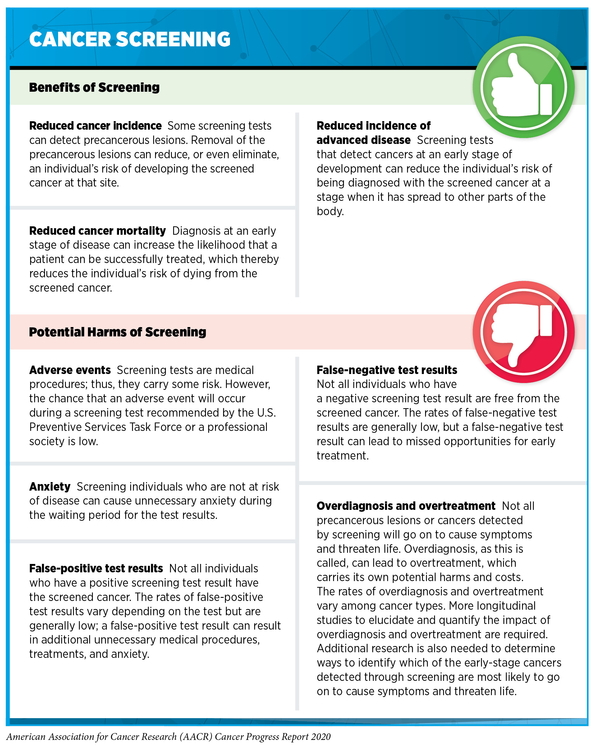 Screening for cancer has many benefits, including reducing the likelihood of an individual being diagnosed with the screened cancer at an advanced stage and of dying from the screened cancer (see sidebar on Cancer Screening). For example, recent data have shown that women who participated in mammography screening were 25 percent less likely to be diagnosed with advanced breast cancer and 41 percent less likely to be diagnosed with breast cancer that they would die from within 10 years of the diagnosis (282)SW D, L T, AM Y, PB D, RA S, H J, et al. Mammography Screening Reduces Rates of Advanced and Fatal Breast Cancers: Results in 549,091 Women. Cancer [Internet]. Cancer; 2020 [cited 2020 Jul 1];126.. However, screening for cancer also has the potential to cause unintended harms, which is why it is not recommended for everyone. Determining whether and for whom a cancer screening test can provide benefits that outweigh the potential harms requires extensive research and careful analysis of the data generated.