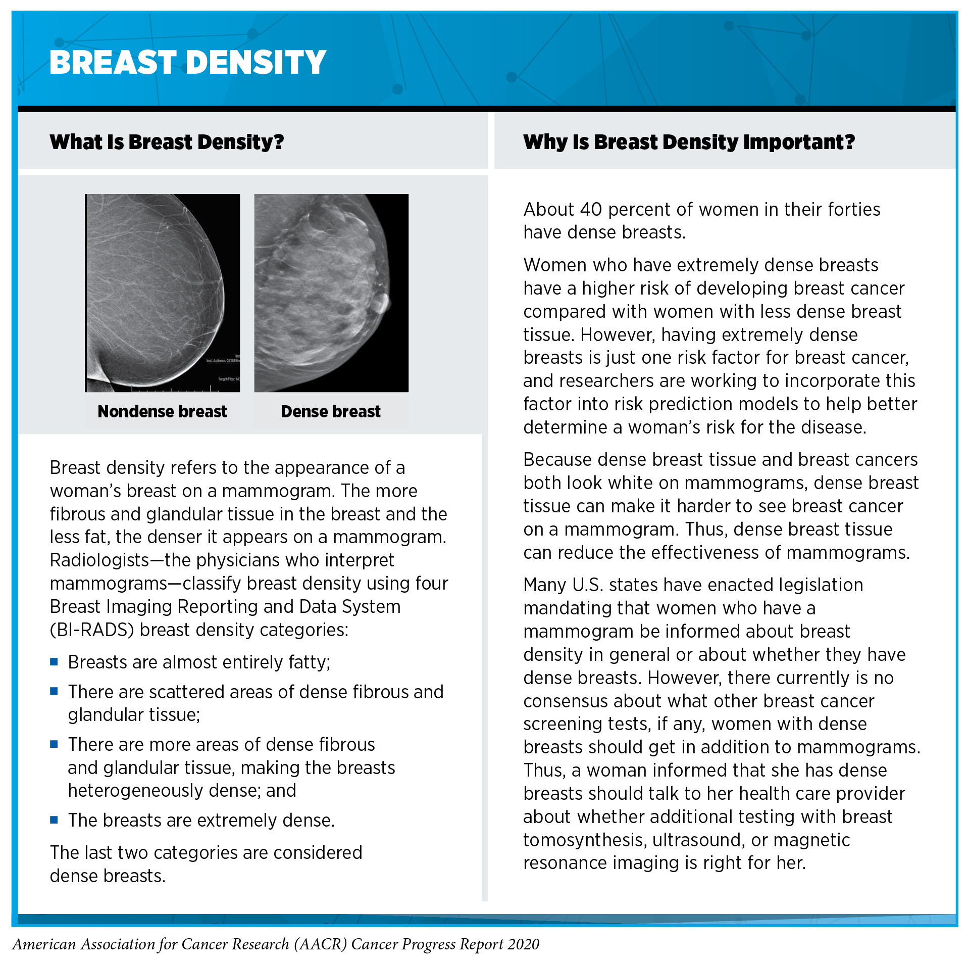 As we increase our understanding of the biology of precancerous and cancerous lesions we will be able to better tailor cancer prevention and early detection to the individual patient, ushering in a new era of precision cancer prevention (294)(295). One area of interest is whether screening guidelines should differ for individuals from different racial and ethnic minority groups. For example, researchers have suggested that lung cancer screening recommendations may need to be less stringent for African Americans after it was shown that African American men have an increased risk of lung cancer despite lower pack years of smoking (296)Aldrich MC, Mercaldo SF, Sandler KL, Blot WJ, Grogan EL, Blume JD. Evaluation of USPSTF Lung Cancer Screening Guidelines Among African American Adult Smokers. JAMA Oncol [Internet]. 2019 [cited 2020 Jan 27];5:1318.. Another area of intensive research investigation is whether cancer screening should be tailored depending on the density of a woman’s breasts because women who have dense breasts have a higher risk of developing breast cancer compared with those who have less dense breasts. Early data suggest that using magnetic resonance imaging (MRI) rather than mammography or using both MRI and mammography may increase the detection of invasive breast cancer during screening of women with dense breasts (297)Bakker MF, de Lange S V., Pijnappel RM, Mann RM, Peeters PHM, Monninkhof EM, et al. Supplemental MRI Screening for Women with Extremely Dense Breast Tissue. N Engl J Med [Internet]. Massachusetts Medical Society; 2019 [cited 2020 Jul 1];381:2091–102.(298)Comstock CE, Gatsonis C, Newstead GM, Snyder BS, Gareen IF, Bergin JT, et al. Comparison of Abbreviated Breast MRI vs Digital Breast Tomosynthesis for Breast Cancer Detection Among Women With Dense Breasts Undergoing Screening. JAMA [Internet]. American Medical Association; 2020 [cited 2020 Jul 1];323:746., but whether this translates to reductions in deaths from breast cancer has yet to be determined. Survivors of cancer diagnosed in childhood or adolescence are another group who require carefully tailored cancer prevention and early detection plans because they are at increased risk of developing another type of cancer in adulthood and cancer is a leading cause of death among this group (299)Turcotte LM, Neglia JP, Reulen RC, Ronckers CM, Leeuwen FE van, Morton LM, et al. Risk, Risk Factors, and Surveillance of Subsequent Malignant Neoplasms in Survivors of Childhood Cancer: A Review. J Clin Oncol [Internet]. American Society of Clinical Oncology; 2018 [cited 2020 Jul 1];36:2145.(300)Armstrong GT, Chen Y, Yasui Y, Leisenring W, Gibson TM, Mertens AC, et al. Reduction in Late Mortality among 5-Year Survivors of Childhood Cancer. N Engl J Med [Internet]. NIH Public Access; 2016 [cited 2019 Jun 20];374:833–42.(see Supporting Cancer Patients and Survivors).