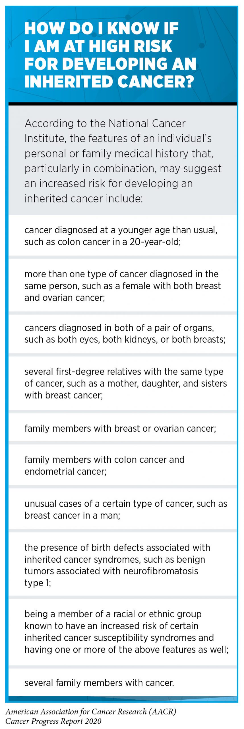 Given that our knowledge of inherited cancer risk is continually increasing, it is important that individuals maintain an ongoing dialog with their health care provider and continually evaluate whether genetic testing is available and/or right for them. African American women are more likely to be diagnosed with breast cancer at a younger age than white women and are more likely to be diagnosed with biologically aggressive forms of the disease at all ages. Therefore, one area of intensive research investigation is whether disparities in breast cancer outcomes for African American women can be eliminated by changing the recommendations for genetic testing based on race and/or ethnicity and by ensuring that those African American women for whom genetic testing is currently recommended undergo testing (291)JR P, EC P, C H, EM J, C H, SN H, et al. Contribution of Germline Predisposition Gene Mutations to Breast Cancer Risk in African American Women. J Natl Cancer Inst [Internet]. J Natl Cancer Inst; 2020 [cited 2020 Jul 1];(292)L N. US Preventive Services Task Force Breast Cancer Recommendation Statement on Risk Assessment, Genetic Counseling, and Genetic Testing for BRCA-Related Cancer. JAMA Surg [Internet]. JAMA Surg; 2019 [cited 2020 Jul 1];154..