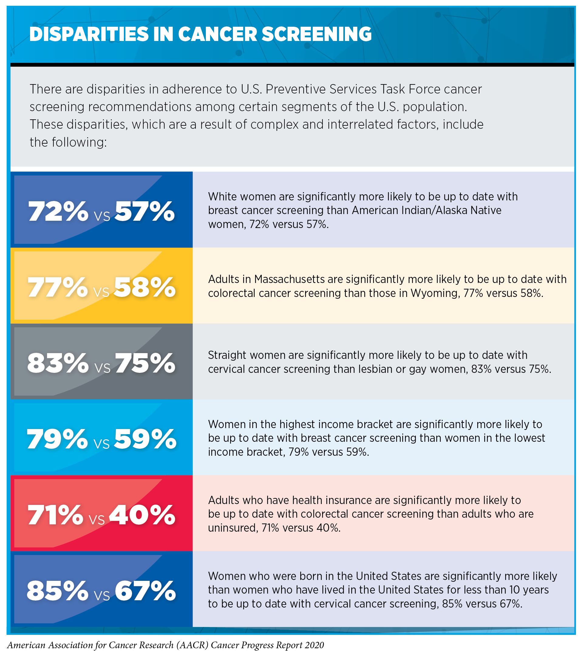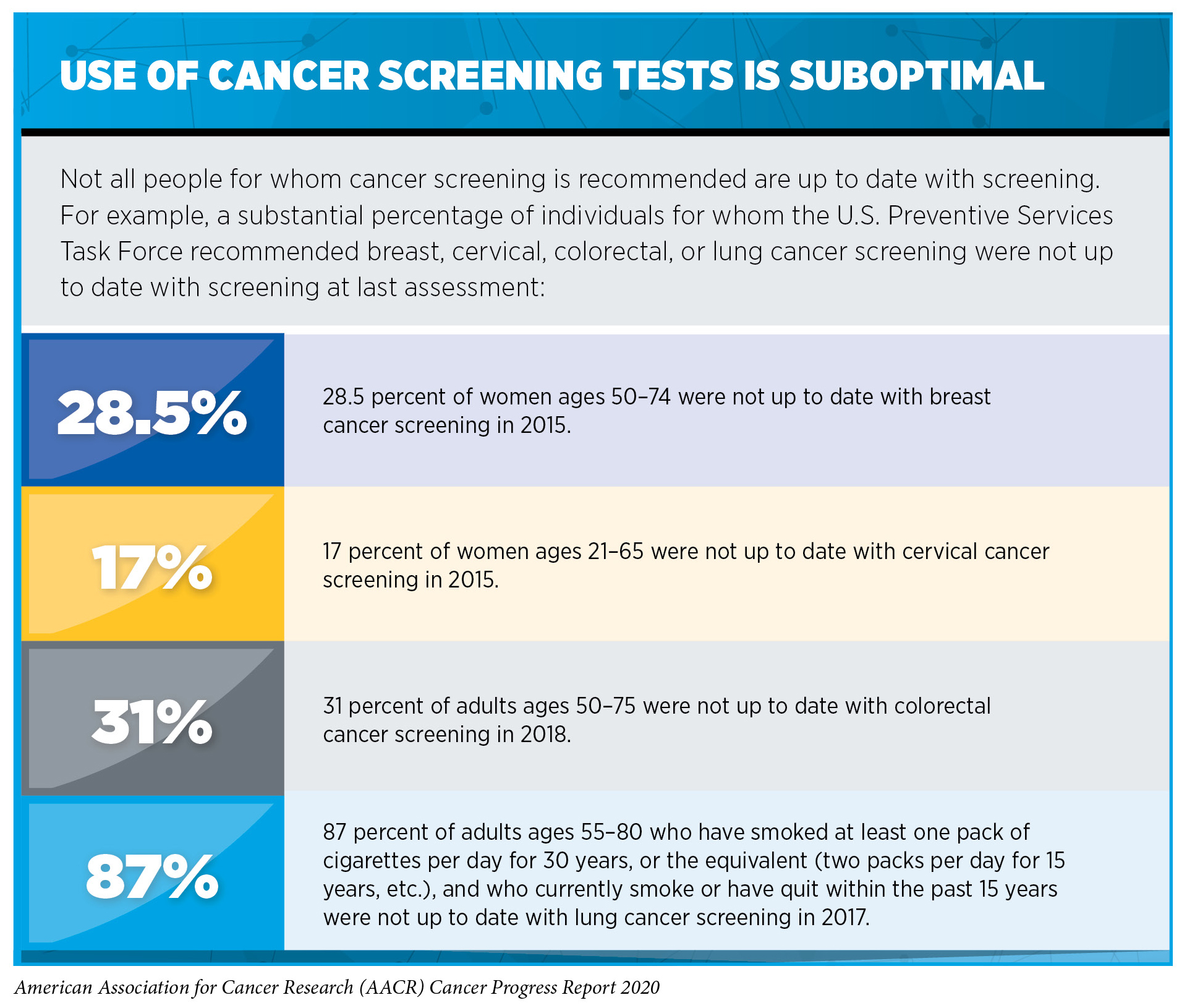 The suboptimal use of cancer screening tests and the significant disparities in cancer screening rates among certain segments of the U.S. population highlight the need for new strategies and public policies to increase cancer screening awareness, access, and uptake among those for whom screening is recommended. Actively reaching out and providing individuals with culturally sensitive information can help optimize use of cancer screening tests (307)Schonberg MA, Kistler CE, Pinheiro A, Jacobson AR, Aliberti GM, Karamourtopoulos M, et al. Effect of a Mammography Screening Decision Aid for Women 75 Years and Older. JAMA Intern Med [Internet]. American Medical Association; 2020 [cited 2020 Jul 1];180:831.)(308)Rice K, Gressard L, DeGroff A, Gersten J, Robie J, Leadbetter S, et al. Increasing colonoscopy screening in disparate populations: Results from an evaluation of patient navigation in the New Hampshire Colorectal Cancer Screening Program. Cancer [Internet]. 2017 [cited 2019 Jun 20];123:3356–66.(309)Dougherty MK, Brenner AT, Crockett SD, Gupta S, Wheeler SB, Coker-Schwimmer M, et al. Evaluation of Interventions Intended to Increase Colorectal Cancer Screening Rates in the United States: A Systematic Review and Meta-analysis. JAMA Intern Med [Internet]. American Medical Association; 2018 [cited 2019 Dec 17];178:1645–58.(310)Liu D, Schuchard H, Burston B, Yamashita T, Albert S. Interventions to Reduce Healthcare Disparities in Cancer Screening Among Minority Adults: a Systematic Review. J Racial Ethn Heal Disparities [Internet]. 2020 [cited 2020 Jul 1];. This can be done in the form of mailing information to individuals, as exemplified by the reduction in the number of women above the USPSTF-recommended cut-off age for breast cancer screening—those age 75 and older—who underwent breast cancer screening after receiving a pamphlet about mammography before they visited their doctor (307)Schonberg MA, Kistler CE, Pinheiro A, Jacobson AR, Aliberti GM, Karamourtopoulos M, et al. Effect of a Mammography Screening Decision Aid for Women 75 Years and Older. JAMA Intern Med [Internet]. American Medical Association; 2020 [cited 2020 Jul 1];180:831.. It can also be done through patient navigation programs that provide individualized assistance to help patients overcome personal and health care system barriers, and to facilitate understanding and timely access to screening (308)Rice K, Gressard L, DeGroff A, Gersten J, Robie J, Leadbetter S, et al. Increasing colonoscopy screening in disparate populations: Results from an evaluation of patient navigation in the New Hampshire Colorectal Cancer Screening Program. Cancer [Internet]. 2017 [cited 2019 Jun 20];123:3356–66.(309)Dougherty MK, Brenner AT, Crockett SD, Gupta S, Wheeler SB, Coker-Schwimmer M, et al. Evaluation of Interventions Intended to Increase Colorectal Cancer Screening Rates in the United States: A Systematic Review and Meta-analysis. JAMA Intern Med [Internet]. American Medical Association; 2018 [cited 2019 Dec 17];178:1645–58.(310)Liu D, Schuchard H, Burston B, Yamashita T, Albert S. Interventions to Reduce Healthcare Disparities in Cancer Screening Among Minority Adults: a Systematic Review. J Racial Ethn Heal Disparities [Internet]. 2020 [cited 2020 Jul 1];. Another approach that has been shown to successfully increase colorectal and cervical cancer screening rates is to mail individuals a stool test or an HPV kit, respectively, that allows people to take their own sample at home (309)Dougherty MK, Brenner AT, Crockett SD, Gupta S, Wheeler SB, Coker-Schwimmer M, et al. Evaluation of Interventions Intended to Increase Colorectal Cancer Screening Rates in the United States: A Systematic Review and Meta-analysis. JAMA Intern Med [Internet]. American Medical Association; 2018 [cited 2019 Dec 17];178:1645–58.(311)RL W, J L, JA T, DL M, T B, H G, et al. Effect of Mailed Human Papillomavirus Test Kits vs Usual Care Reminders on Cervical Cancer Screening Uptake, Precancer Detection, and Treatment: A Randomized Clinical Trial. JAMA Netw open [Internet]. JAMA Netw Open; 2019 [cited 2020 Jul 1];2..