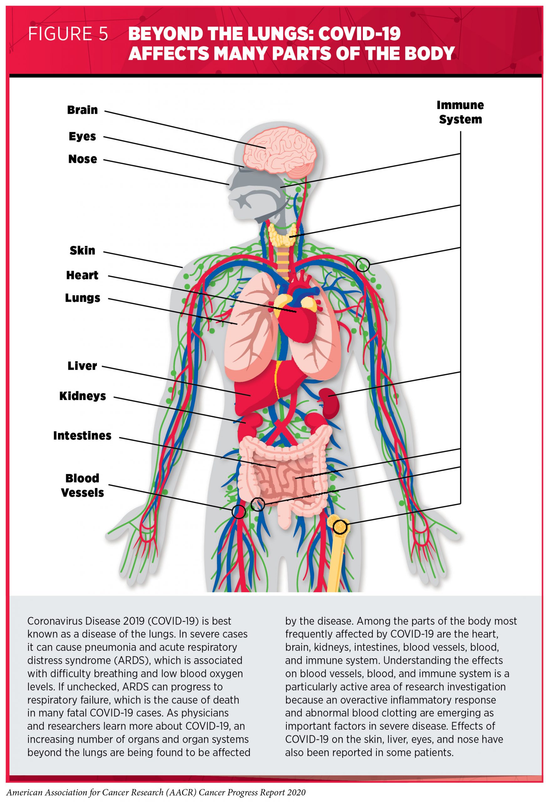 One possible explanation for the widespread damage seen in some patients who have COVID-19 is an overactive inflammatory response (69)Tay MZ, Poh CM, Rénia L, MacAry PA, Ng LFP. The trinity of COVID-19: immunity, inflammation and intervention. Nat Rev Immunol [Internet]. Nature Publishing Group; 2020 [cited 2020 Aug 1];20:363–74.(67)Gupta A, Madhavan M V., Sehgal K, Nair N, Mahajan S, Sehrawat TS, et al. Extrapulmonary manifestations of COVID-19. Nat Med [Internet]. Nature Publishing Group; 2020 [cited 2020 Jul 15];26:1017–32.. This can lead to a condition known as cytokine-release syndrome and severe, systemic inflammation. Inflammation in the lungs can progress to acute respiratory distress syndrome (ARDS), causing difficulty breathing and low blood oxygen levels. If unchecked, ARDS can progress to respiratory failure, which is the cause of death in many fatal COVID-19 cases. In addition, uncontrolled cytokine-release syndrome can lead to failure of other organs, most notably the heart, liver, and kidneys. Another explanation for the widespread damage in some patients who have COVID-19 is that cells lining the blood vessels can become damaged by the virus and/or the inflammatory response, which triggers abnormal blood clotting (67)Gupta A, Madhavan M V., Sehgal K, Nair N, Mahajan S, Sehrawat TS, et al. Extrapulmonary manifestations of COVID-19. Nat Med [Internet]. Nature Publishing Group; 2020 [cited 2020 Jul 15];26:1017–32.. This, in turn, can cause widespread organ damage.