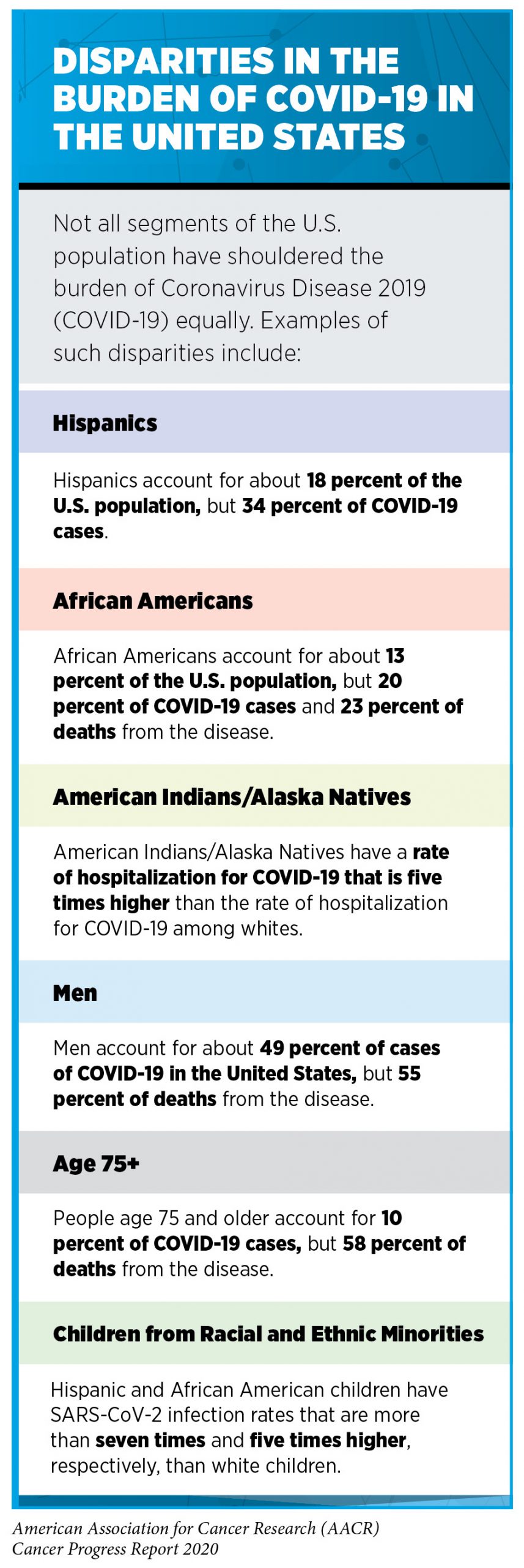 As of July 31, 2020, 17,622,478 people worldwide have been diagnosed with COVID-19, and more than 680,165 people have died from the disease (61)COVID-19 Map – Johns Hopkins Coronavirus Resource Center [Internet]. [cited 2020 Jul 15].. The United States accounts for more than one in every four recorded cases of COVID-19 and almost one in every four recorded deaths from the disease. As with the burden of cancer, certain segments of the U.S. population have shouldered a disproportionate burden of COVID-19 (see sidebar on Disparities in the Burden of COVID-19 in the United States).
