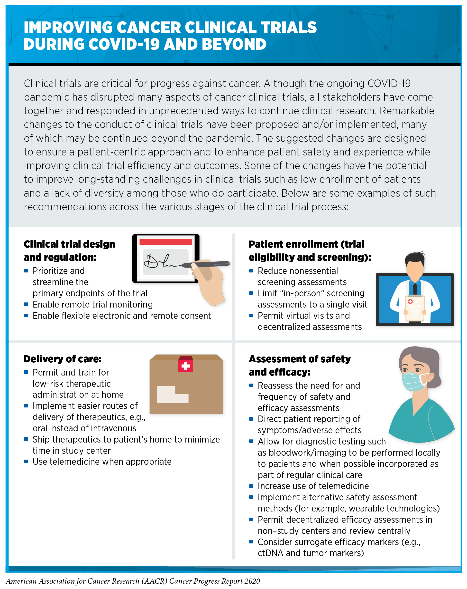 One area of research that has been significantly disrupted during the COVID-19 pandemic is the conduct of all types of clinical trials, including cancer clinical trials. One report estimated that globally, there was a 74 percent decrease in the number of new patients enrolling in clinical trials during the first two weeks of May 2020 compared with the same period in 2019 (100)Gewin V. The career cost of COVID-19 to female researchers, and how science should respond. Nature [Internet]. 2020 [cited 2020 Aug 15];583:867–9.. More recent analysis from the same group indicates that enrollment in clinical trials has increased since the first two weeks of May 2020, but it remains 30 percent lower than before the COVID-19 pandemic (101)Langin K. The pandemic is hitting scientist parents hard, and some solutions may backfire. Science (80- ) [Internet]. 2020 [cited 2020 Aug 15];. In the United States, it was estimated that the number of patients enrolled each week in NCI-sponsored clinical trials more than halved between early March and early April 2020 (102)Woolston C. ‘It’s like we’re going back 30 years’: how the coronavirus is gutting diversity in science. Nature [Internet]. 2020 [cited 2020 Aug 15];. A separate report found that only 20 percent of the U.S. institutions that were surveyed for the report were continuing to enroll patients in cancer clinical trials at pre-COVID-19 rates (103)Medidata. COVID-19 and Clinical Trials: The Medidata Perspective. Release 5.0. 2020;. Among the challenges to clinical trial enrollment and conduct are a decrease in the ability or willingness of patients to go to health care facilities and the limited availability of services such as radiology, surgery, and cardiology (104). All stakeholders are working together to adapt clinical trial practices to ensure that ongoing and new clinical trials can safely continue (104)(105)Unger JM, Blanke CD, LeBlanc M, Hershman DL. Association of the Coronavirus Disease 2019 (COVID-19) Outbreak With Enrollment in Cancer Clinical Trials. JAMA Netw Open [Internet]. American Medical Association; 2020 [cited 2020 Aug 2];3:e2010651.(106)Upadhaya S, Yu JX, Oliva C, Hooton M, Hodge J, Hubbard-Lucey VM. Impact of COVID-19 on oncology clinical trials. Nat Rev Drug Discov [Internet]. 2020 [cited 2020 Aug 2];19:376–7.. Many of the adjustments to cancer clinical trial practice already made and being considered in response to the COVID-19 pandemic have the potential to lead to long-term positive changes (see sidebar on Improving Cancer Clinical Trials during COVID-19 and Beyond).