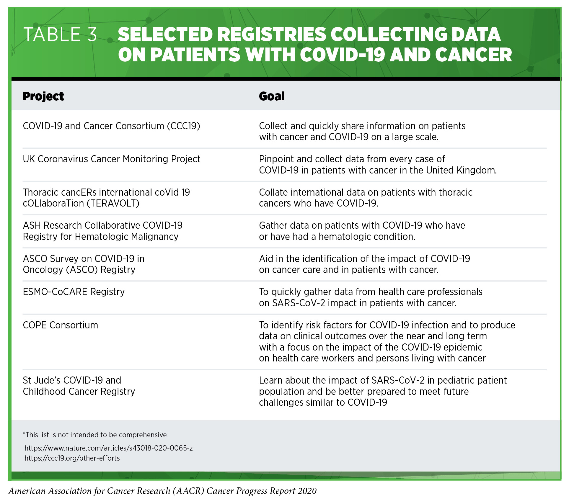 In addition, cancer researchers around the world are working together to leverage their experience to accelerate SARS-CoV-2 vaccine and therapeutic development, and to repurpose treatments used in cancer care for the benefit of patients with COVID-19. An area in which cancer researchers have vast expertise is the collection and sharing of “big data.” This expertise is being harnessed to better understand the effect of COVID-19 on patients with cancer. The goal is to obtain clinical and other patient-related information on a large enough scale to answer questions about the epidemiology of COVID-19 among patients with cancer as well as clinical data on the effectiveness of COVID-19 diagnostics, vaccines, and treatments in these patients. Several cancer organizations as well as multi-institutional teams have already launched initiatives to catalyze data sharing (see Table 3).