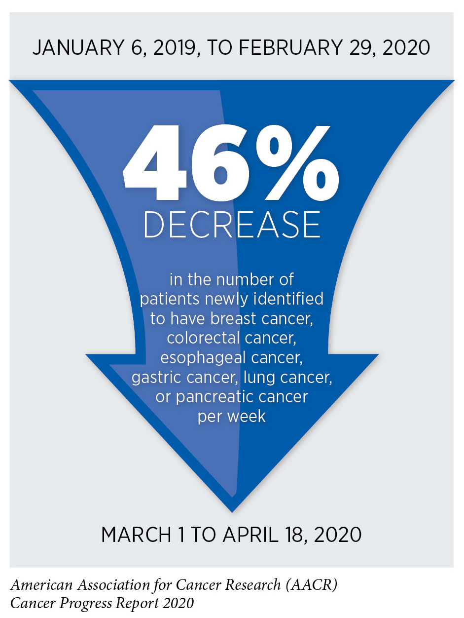 There is deep concern about the consequences that delays in cancer screening, diagnosis, and treatment will have on outcomes for patients with cancer (10)Sharpless NE. COVID-19 and cancer. Science [Internet]. American Association for the Advancement of Science; 2020 [cited 2020 Jun 29];368:1290.(94)Hoehn RS, Zureikat AH. Cancer disparities in the COVID-19 era. J Surg Oncol [Internet]. Wiley-Blackwell; 2020 [cited 2020 Jul 16];. Data from electronic medical records from 190 hospitals spanning 23 states show that the number of screening tests for early detection of cervical, breast, and colon cancer conducted in the United States plummeted by 85 percent or more after the first COVID-19 case was reported in the United States on January 20, 2020 (95)EPIC Health Research Network. Preventive Cancer Screenings during COVID-19 Pandemic. 2020;1–5., and a recent survey of patients with cancer found that 79 percent of those who are actively undergoing treatment had to delay some aspect of their care as a result of COVID-19, including 17 percent who reported delays to their cancer treatment (96)Cancer Action Netwrok. COVID-19 Pandemic Impact on Cancer Patients and Survivors: Survey Findings Summary. 2020;1–5.. It will take years to determine the consequences of all the delays, but researchers at the NCI have estimated that there will be at least 10,000 additional deaths from breast cancer and colorectal cancer over the next decade in the United States as a result of the negative impact that the COVID-19 pandemic has had on screening and treatment for these two types of cancer (10)Sharpless NE. COVID-19 and cancer. Science [Internet]. American Association for the Advancement of Science; 2020 [cited 2020 Jun 29];368:1290..