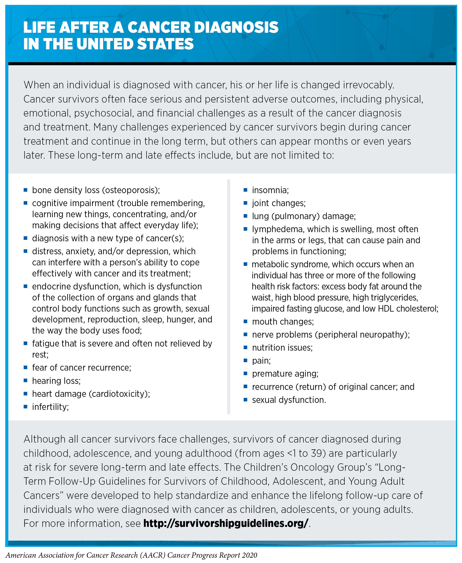 In recent years, some of the changes in cancer treatment are helping to reduce the short-term, long-term, and late effects of treatment. This is improving quality of life for patients and survivors, allowing many of them to continue to live their lives, as Congresswomen Lucy McBath was able to do when she was treated for breast cancer. For example, molecularly targeted therapeutics more precisely target a patient’s cancer cells compared with cytotoxic chemotherapeutics and therefore tend to cause fewer adverse effects. In addition, researchers are identifying ways to tailor surgery, radiotherapy, and cytotoxic chemotherapy to minimize their adverse effects without negatively affecting survival. The success of these approaches is highlighted by research showing that significantly fewer survivors of cancer diagnosed in childhood are experiencing and dying because of late effects of cancer treatment, such as a new cancer or heart disease, compared with three decades ago, and that this progress is expected to translate into further improvements in life expectancy for these individuals in the future (300)Armstrong GT, Chen Y, Yasui Y, Leisenring W, Gibson TM, Mertens AC, et al. Reduction in Late Mortality among 5-Year Survivors of Childhood Cancer. N Engl J Med [Internet]. NIH Public Access; 2016 [cited 2019 Jun 20];374:833–42.(439)DA M, G H, KK N, MJ E, Y Y, D D, et al. Major Cardiac Events for Adult Survivors of Childhood Cancer Diagnosed Between 1970 and 1999: Report From the Childhood Cancer Survivor Study Cohort. BMJ [Internet]. BMJ; 2020 [cited 2020 Jul 3];368.(440)Yeh JM, Ward ZJ, Chaudhry A, Liu Q, Yasui Y, Armstrong GT, et al. Life Expectancy of Adult Survivors of Childhood Cancer Over 3 Decades. JAMA Oncol [Internet]. American Medical Association; 2020 [cited 2020 Jul 3];6:350..