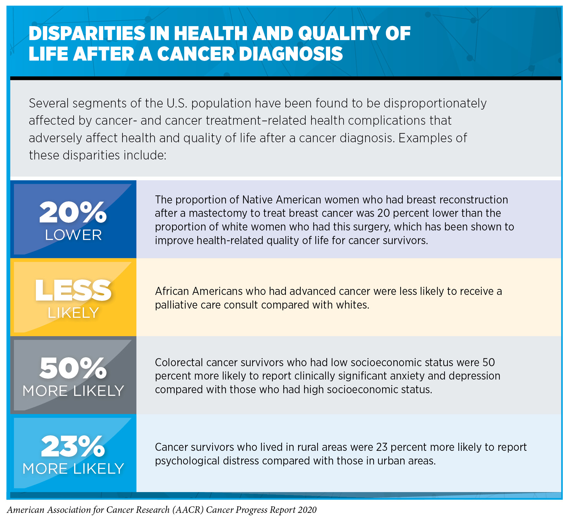 Unfortunately, financial hardship is not the only challenge posed by cancer and cancer treatment that disproportionately affects certain segments of the U.S. population. There are disparities in many of the health complications related to cancer and cancer treatment that adversely affect the health and quality of life of patients and survivors with cancer, as well as disparities in receipt of care to overcome these complications (see sidebar on Disparities in Health and Quality of Life after a Cancer Diagnosis).