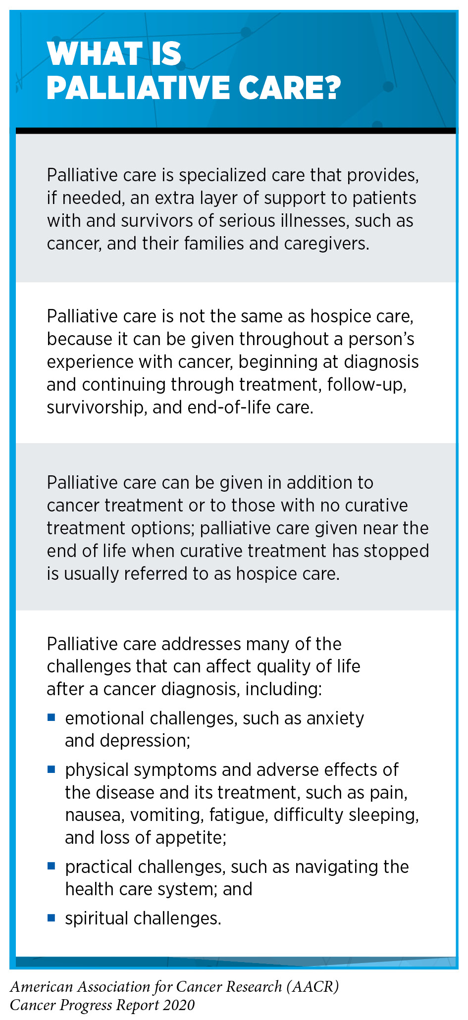 Palliative care is one approach that is being increasingly used to optimize the quality of life for patients and survivors with cancer, as well as their families and caregivers (see sidebar on What Is Palliative Care?). Palliative care can be given throughout a person’s experience with cancer, beginning at diagnosis and continuing through treatment, follow-up, survivorship, and end-of-life care. The goal is not to treat the cancer but to provide an extra layer of care that prevents or treats the symptoms and adverse effects of the disease and its treatment, as well as addresses the psychological, social, and spiritual challenges that accompany a cancer diagnosis.