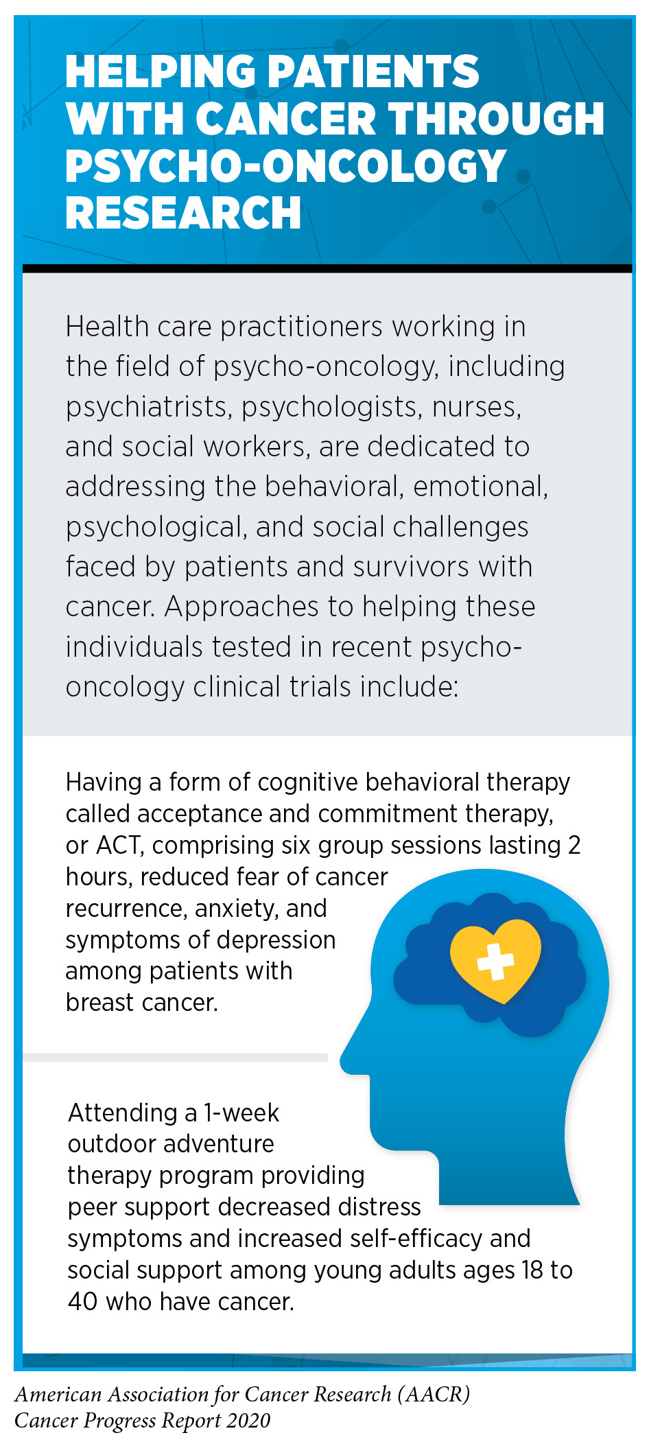 Psycho-oncology is a field of research and branch of medicine that encompasses the work of researchers and health care providers committed to developing new approaches to addressing the behavioral, emotional, psychological, and social challenges posed by cancer (see sidebar on Helping Patients with Cancer through Psycho-oncology Research). Addressing these challenges, which include treatment-related cognitive impairment, fear of cancer recurrence, anxiety, depression, stress, posttraumatic stress disorder, and feelings of despair, is important not just for improving quality of life, but also for improving outcomes because challenges such as depression, anxiety, and low levels of social support are often associated with decreased adherence to cancer treatment and/or decreased survival (476)(477)(478)Pinquart M, Duberstein PR. Associations of social networks with cancer mortality: a meta-analysis. Crit Rev Oncol Hematol [Internet]. NIH Public Access; 2010 [cited 2020 Aug 3];75:122–37.. Given the benefits of psycho-oncology, it is vital that all patients with cancer for whom this intervention is appropriate receive this care.