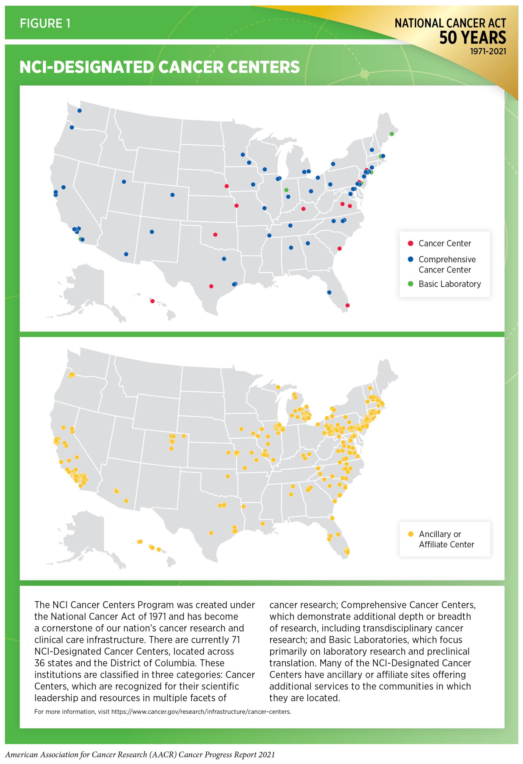 One of the most consequential provisions of the National Cancer Act was the establishment of the NCI Cancer Centers Program to recognize and support institutions across the country that are leading the way in cancer treatment, diagnosis, and prevention. The legislation initially provided the funding to establish 15 cancer research centers and local cancer control programs. Today, there are 71 NCI-designated cancer centers across 36 states and the District of Columbia (see Figure 1).