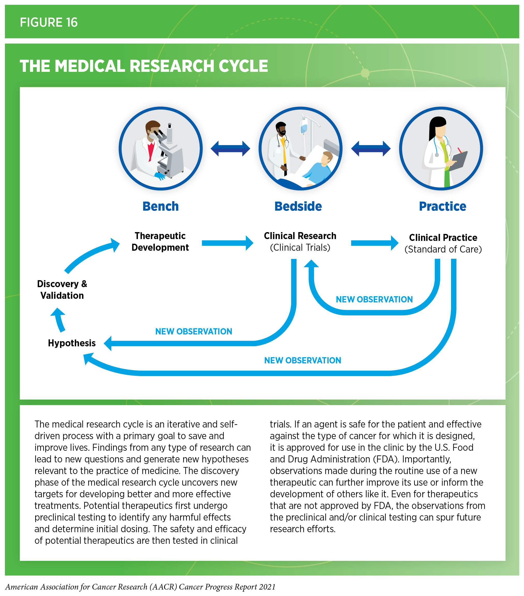 Breakthroughs across the spectrum of cancer science and medicine are improving survival and quality of life for patients around the globe. These advances against cancer are driven by concerted efforts from stakeholders working throughout the medical research cycle (Figure 16).