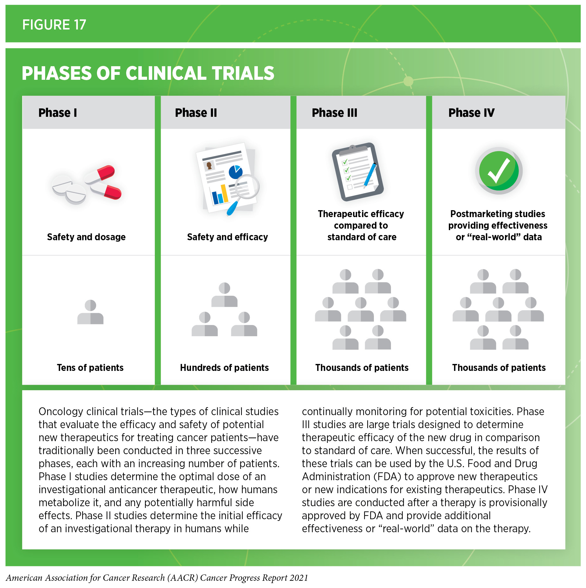 Clinical trials testing the efficacy and safety of candidate anticancer therapeutics are traditionally conducted in three consecutive phases (see Figure 17). This approach requires substantial investment, thousands of participants, and many years to complete clinical trials. The result is a lengthy and costly undertaking that poses major barriers to rapidly translating discoveries into clinical advances.