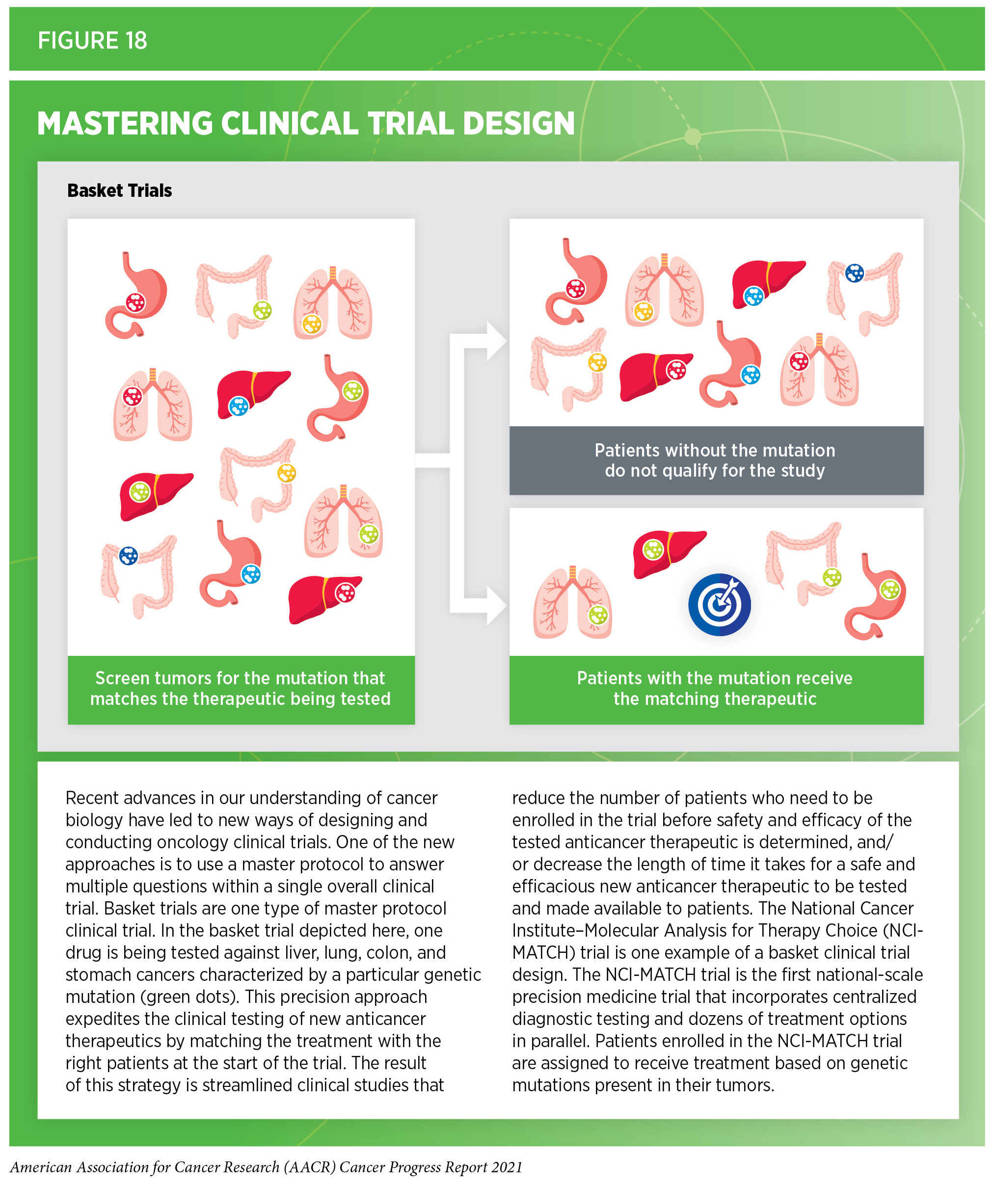 Master protocol design aims to streamline clinical trials by: 1) matching the right therapeutics with the right patient more quickly; 2) reducing the number of patients needed to test the efficacy and safety of the drug; and 3) decreasing the length of time it takes for a new anticancer therapeutic to be tested and made available to patients if the trial shows it is safe and effective (389)Ajmera Y, Singhal S, Dwivedi SN, Dey AB. The changing perspective of clinical trial designs. Perspect Clin Res. 2021;12(2).. Furthermore, the master protocol design addresses multiple questions within a single overall clinical trial. Advances in our understanding of the genetic mutations that drive cancer development are further helping to shape clinical trial design. As an example, “basket” trials allow researchers to test one anticancer drug in a group of patients with a common genetic mutation against which the drug is targeted, regardless of the tissue of origin of the cancer (386)Park JJH, Hsu G, Siden EG, Thorlund K, Mills EJ. An overview of precision oncology basket and umbrella trials for clinicians. CA Cancer J Clin. 2020;70(2).(see Figure 18).