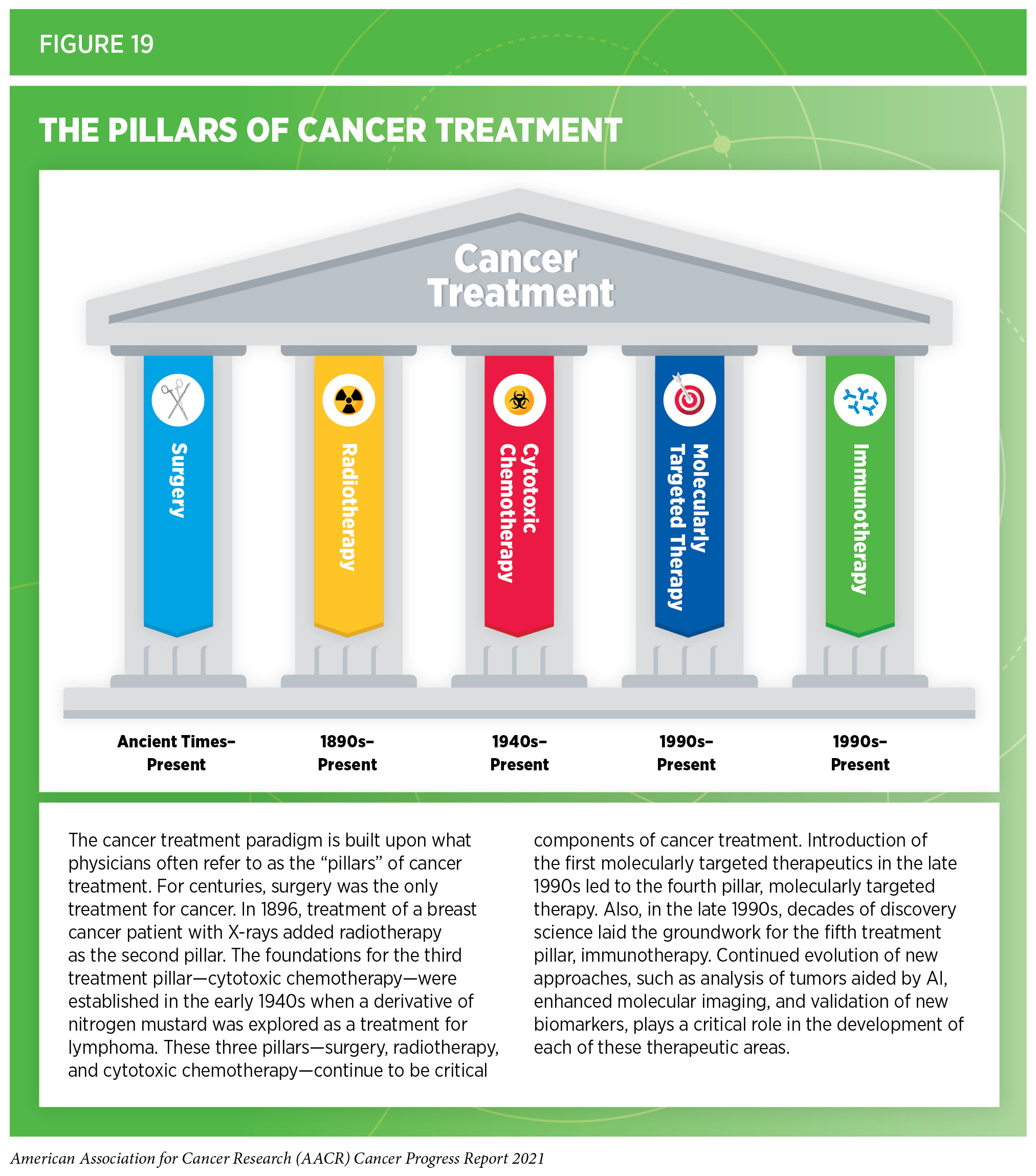 Discovery science continuously drives breakthroughs in cancer etiology, prevention, detection, diagnosis, treatment, and survivorship. Clinical breakthroughs that lead to the FDA approval of anticancer therapeutics and medical devices, in turn, accelerate the pace of the medical research cycle through new real-world observations (see Figure 16) (see Supplemental Table 2(Pt.1)(Pt.2), and Supplemental Table 3). The overall goal is to refine and/or expand the five pillars—surgery, chemotherapy, radiotherapy, molecularly targeted therapy, and immunotherapy—that constitute the current paradigm for cancer treatment (396)Falzone L, Salomone S, Libra M. Evolution of cancer pharmacological treatments at the turn of the third millennium. Front Pharmacol. 2018;9(NOV).(see Figure 19).