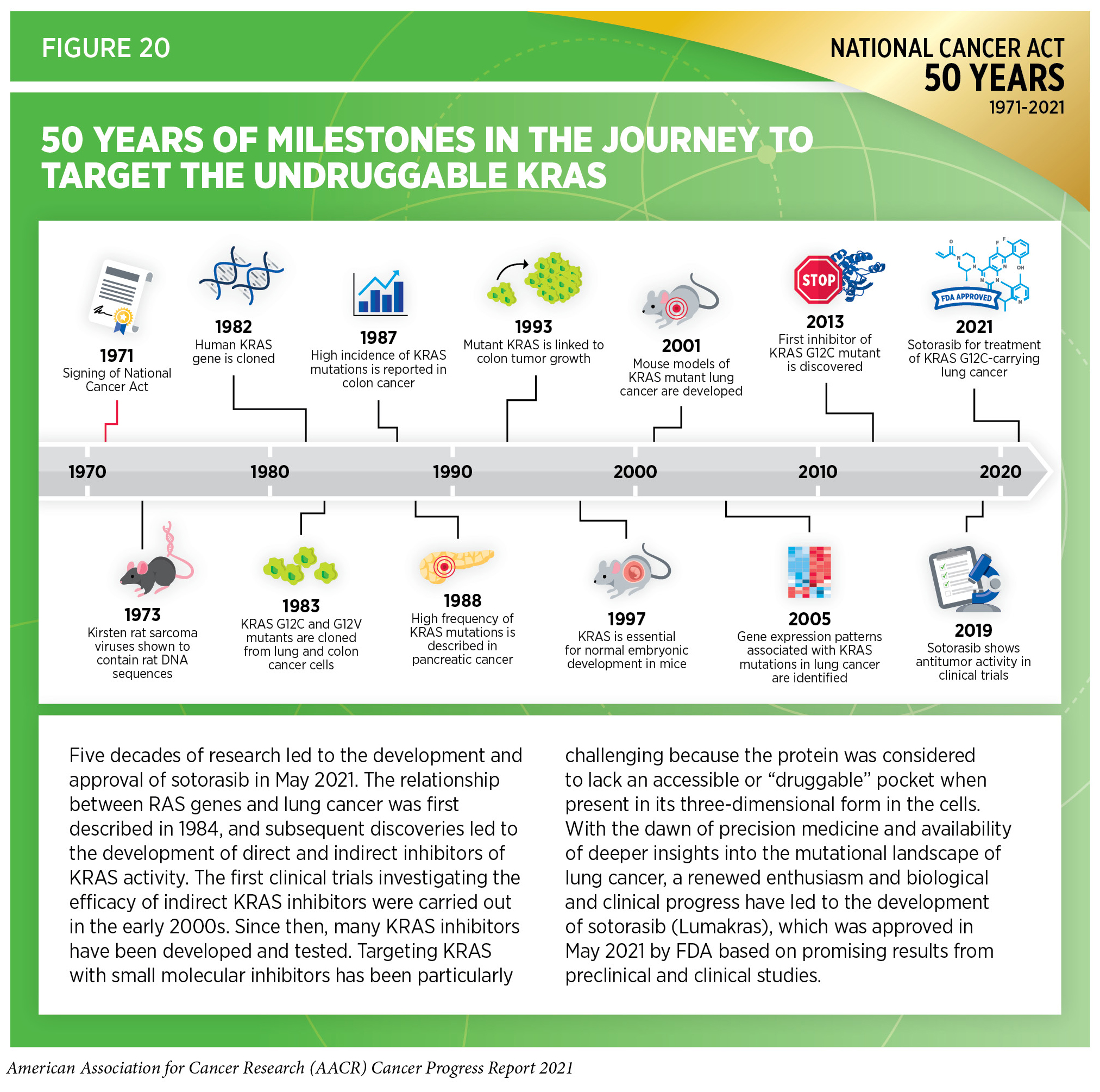 The FDA approved sotorasib (Lumakras) for adult NSCLC patients with locally advanced or metastatic disease, whose tumors harbor the KRAS G12C mutation, a genetic alteration more frequently found in former or current smokers (439)Dogan S, Shen R, Ang DC, et al. Molecular epidemiology of EGFR and KRAS mutations in 3,026 lung adenocarcinomas: Higher susceptibility of women to smoking-related KRAS-mutant cancers. Clin Cancer Res. 2012;18(22).. The approval of sotorasib was based on a phase II clinical trial (440)Skoulidis F, Li BT, Dy GK, et al. Sotorasib for Lung Cancers with KRAS p.G12C Mutation . N Engl J Med. 2021;384(25).. Treatment with sotorasib shrank tumors in over 37 percent of NSCLC patients who had responded poorly to previous treatment with either chemotherapy or immunotherapy. Importantly, responses lasted more than 11 months, and progression -free survival(see Table 6), a measure of how long cancer is held in check, was almost seven months. Even with relatively modest benefits, these responses were roughly two times higher compared to historical results achieved through standard chemotherapy regimens and mark a significant advance for the treatment of patients with KRAS-mutated lung cancer, for whom there are no good options after initial treatment. Developing effective therapeutics that target KRAS has been a daunting challenge and discoveries over the past five decades have fueled the development of sotorasib (Figure 20). Approval of sotorasib and other KRAS inhibitors that are progressing from the bench to the clinic not only brings hope for NSCLC patients, such as Steve Castellaw, but it also holds future promise for treating other KRAS-mutated malignancies that include pancreatic and colorectal cancers.