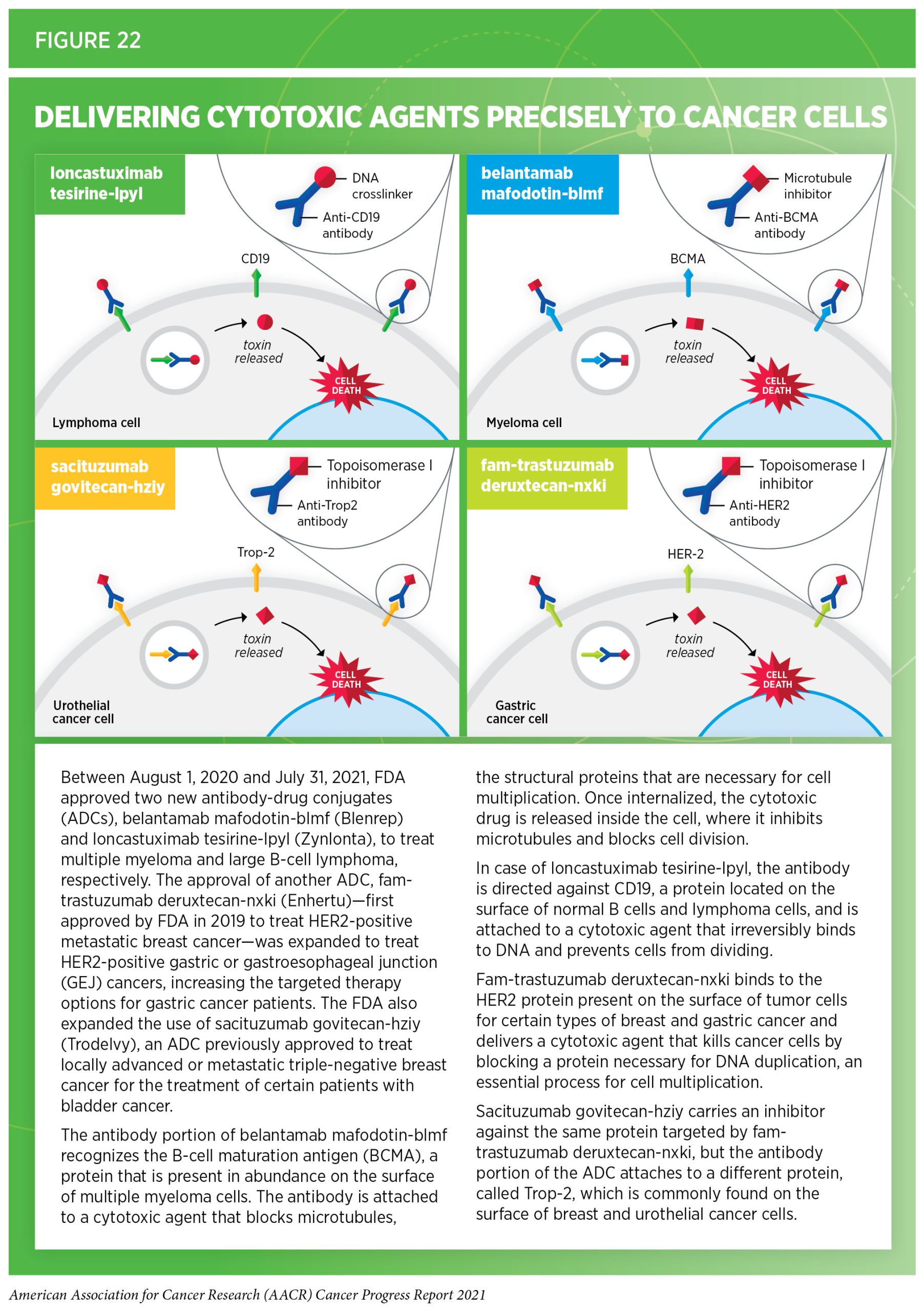 Another ADC approved by FDA during the 12 months covered in this report is loncastuximab tesirine-lpyl (Zynlonta). Loncastuximab tesirine-lpyl comprises an antibody directed against CD19—a protein found in abundance on the surface of cancerous B cells (464)Wang K, Wei G, Liu D. CD19: a biomarker for B cell development, lymphoma diagnosis and therapy. Exp Hematol Oncol. 2012;1(1).—conjugated with a chemotherapeutic alkylating agent that irreversibly binds to DNA and blocks cell division. The FDA approved loncastuximab tesirine-lpyl for adult patients with relapsed or refractory large B-cell lymphoma—including diffuse large B-cell lymphoma (DLBCL)—who have received two or more lines of systemic therapy. DLBCL is the most common type of non-Hodgkin lymphoma (NHL) in the United States, accounting for about one out of every three lymphomas (3)American Cancer Society. American Cancer Society: Cancer Facts and Figures 2021. Atlanta Am Cancer Soc. Published online 2021:13-15.. DLBCL is an aggressive NHL that affects a type of white blood cells called B-lymphocytes, and despite recent treatment advances, such as the use of anti-CD20 monoclonal antibody rituximab (Rituxan), approximately 40 percent of patients relapse or show poor response (465)Xiros N, Economopoulos T, Valsami S, Rontogianni D, Fountzilas G, Raptis S. Rituximab in combination with vinorelbine/gemcitabine chemotherapy in patients with primary refractory or early relapsed T cell rich B cell lymphoma: A pilot study. Leuk Res. 2003. Efficacy of loncastuximab tesirine-lpyl was evaluated in 145 adult patients who participated in a phase II clinical trial. Nearly 50 percent of patients responded favorably to treatment with loncastuximab tesirine-lpyl and showed a significant decrease in cancer. Importantly, DLBCL was undetectable in nearly 25 percent of responders for at least 10 months (466)Hamadani M, Radford J, Carlo-Stella C, et al. Final results of a phase 1 study of loncastuximab tesirine in relapsed/refractory B-cell non-Hodgkin lymphoma. Blood. 2021;137(19)..