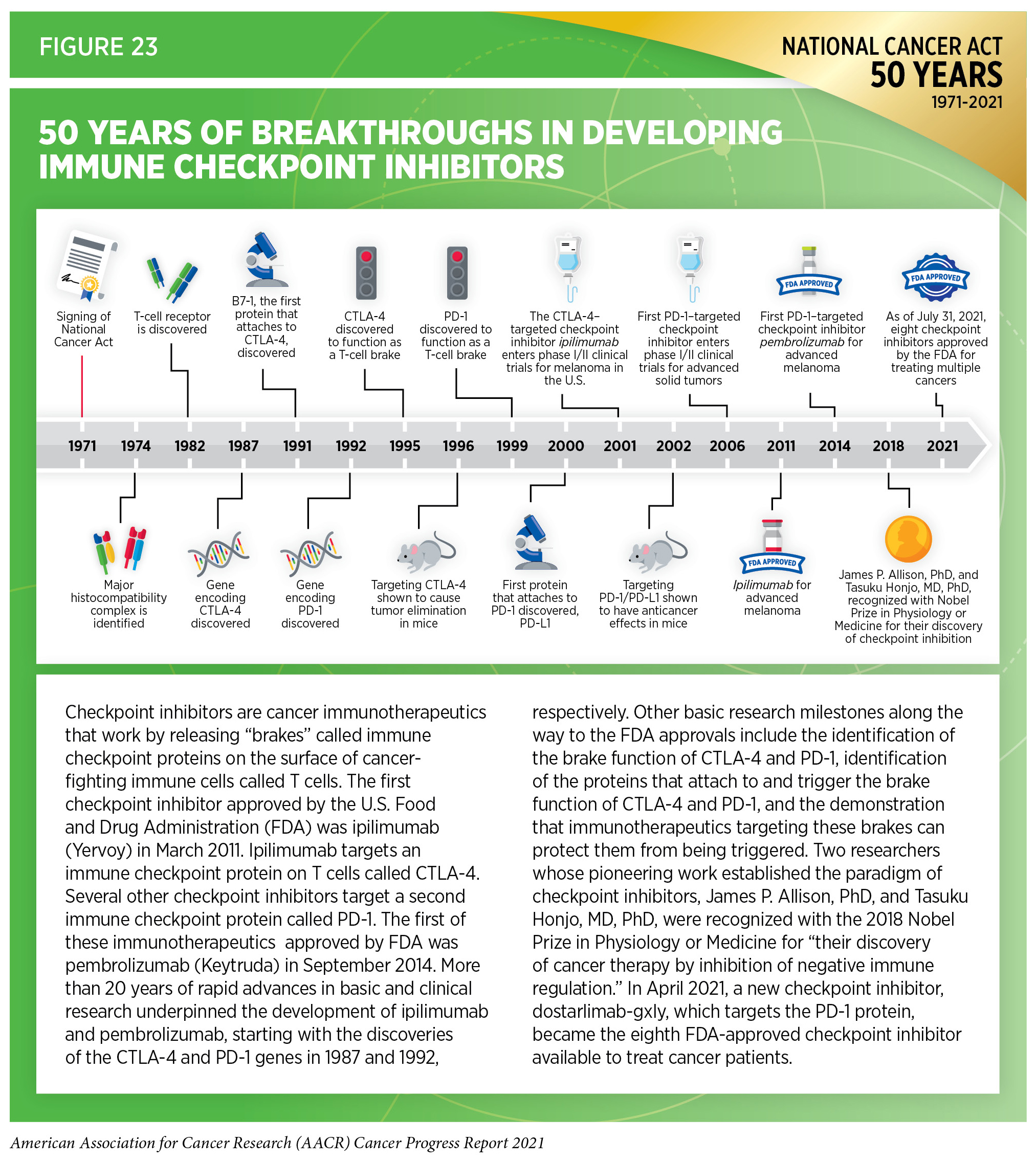 Decades of discovery science have shown that immune cells, called T cells, are naturally capable of destroying cancer cells. We have also learned that some tumor cells have developed ways to escape destruction by T cells. One of the mechanisms by which tumor cells evade elimination by T cells is by expressing high levels of certain proteins that attach to and trigger “brakes” on T cells and stop them from attacking cancers. These brakes are proteins on the surface of T cells and are called immune-checkpoint proteins. Researchers have identified many checkpoint proteins and their binding partners on tumor cells involved in the process of inhibiting T cell activation, three of which—CTLA-4, PD-1, and PD-L1—have proven to be effective targets for drug development (482)Waldman AD, Fritz JM, Lenardo MJ. A guide to cancer immunotherapy: from T cell basic science to clinical practice. Nat Rev Immunol. 2020;20(11). (see Figure 23). This knowledge has spurred a new class of therapeutics—called immune checkpoint inhibitors—that can trigger T cells to destroy cancer cells by releasing these brakes (501)Sharma P, Siddiqui BA, Anandhan S, et al. The Next Decade of Immune Checkpoint Therapy. Cancer Discov. 2021;11(4)..
