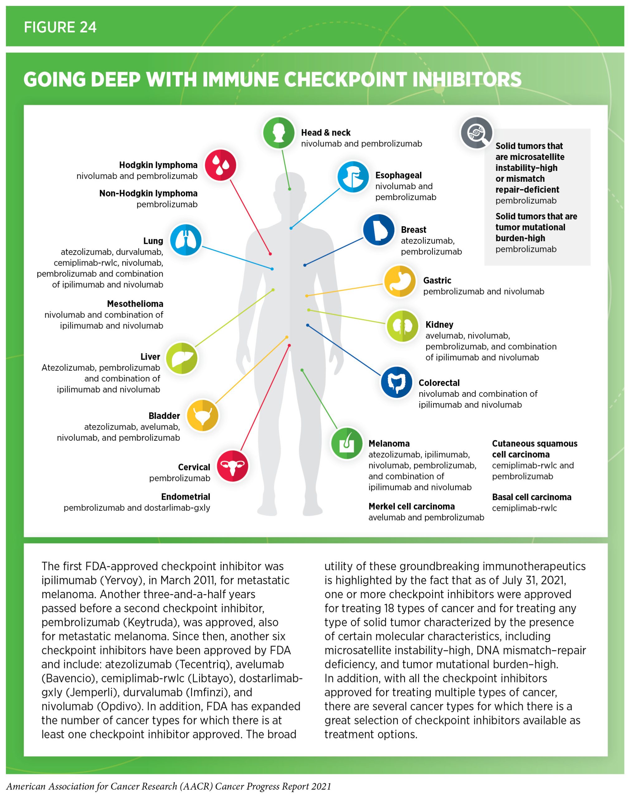 A key advantage of checkpoint inhibitors is their broad utility against cancer, as highlighted by FDA approvals of checkpoint inhibitors to treat multiple types of cancer (see Figure 24). During the 12-month period covered in this report—August 1, 2020 to July 31, 2021—, one of the most significant advances toward realizing the promise of checkpoint inhibitors for treatment of cancer is the FDA approval of a new checkpoint inhibitor, dostarlimab-gxly (Jemperli), to treat metastatic endometrial cancer. During this period, FDA also expanded the use of four previously approved checkpoint inhibitors—cemiplimab-rwlc (Libtayo), nivolumab (Opdivo), pembrolizumab (Keytruda), and ipilimumab (Yervoy)—to treat additional types of cancer. As of July 31, 2021, one or more checkpoint inhibitors have been approved for treating 18 types of cancer and for treating any types of solid tumors that are characterized by certain molecular characteristics, such as microsatellite instability (MSI)–high, DNA mismatch–repair deficiency (dMMR), and tumor mutational burden (TMB)–high.