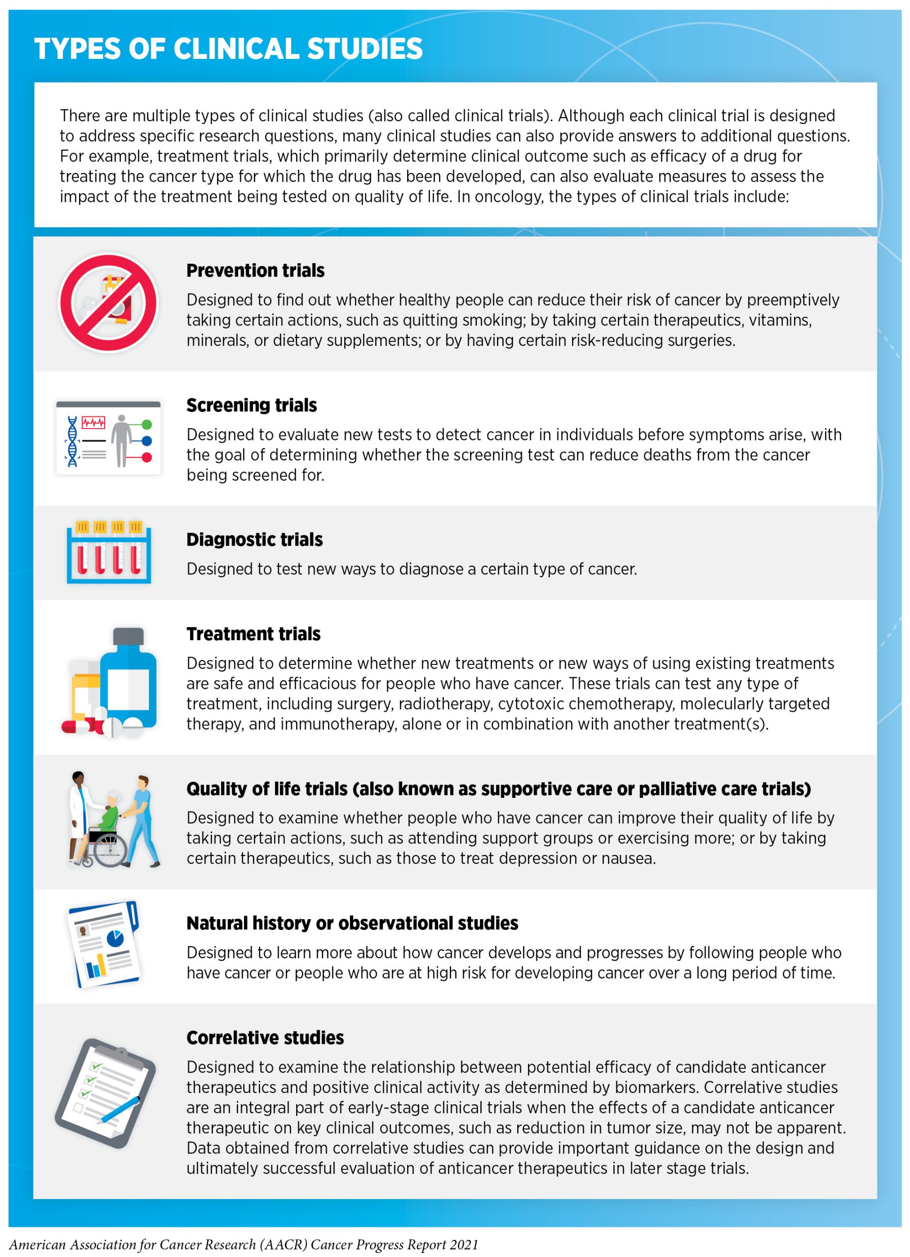 Clinical studies are the backbone of medical research and, together with basic research, provide the foundational knowledge to bring safe and effective medicines to patients in a timely manner. Evidence gathered from clinical studies, also called clinical trials, is reviewed by FDA to determine whether a therapeutic should be approved for use in the clinic. There are many types of clinical trials and each is designed to address different research questions (384)Li A, Bergan RC. Clinical trial design: Past, present, and future in the context of big data and precision medicine. Cancer. 2020;126(22).(see sidebar on Types of Clinical Trials). Because clinical trials involve the use of experimental therapeutics and aim to derive conclusions for the entire population based on data from a cohort of participants, their design and conduct are reviewed and approved by institutional review boards. Clinical trials are closely monitored throughout the duration of the study to ensure safety of the participants.