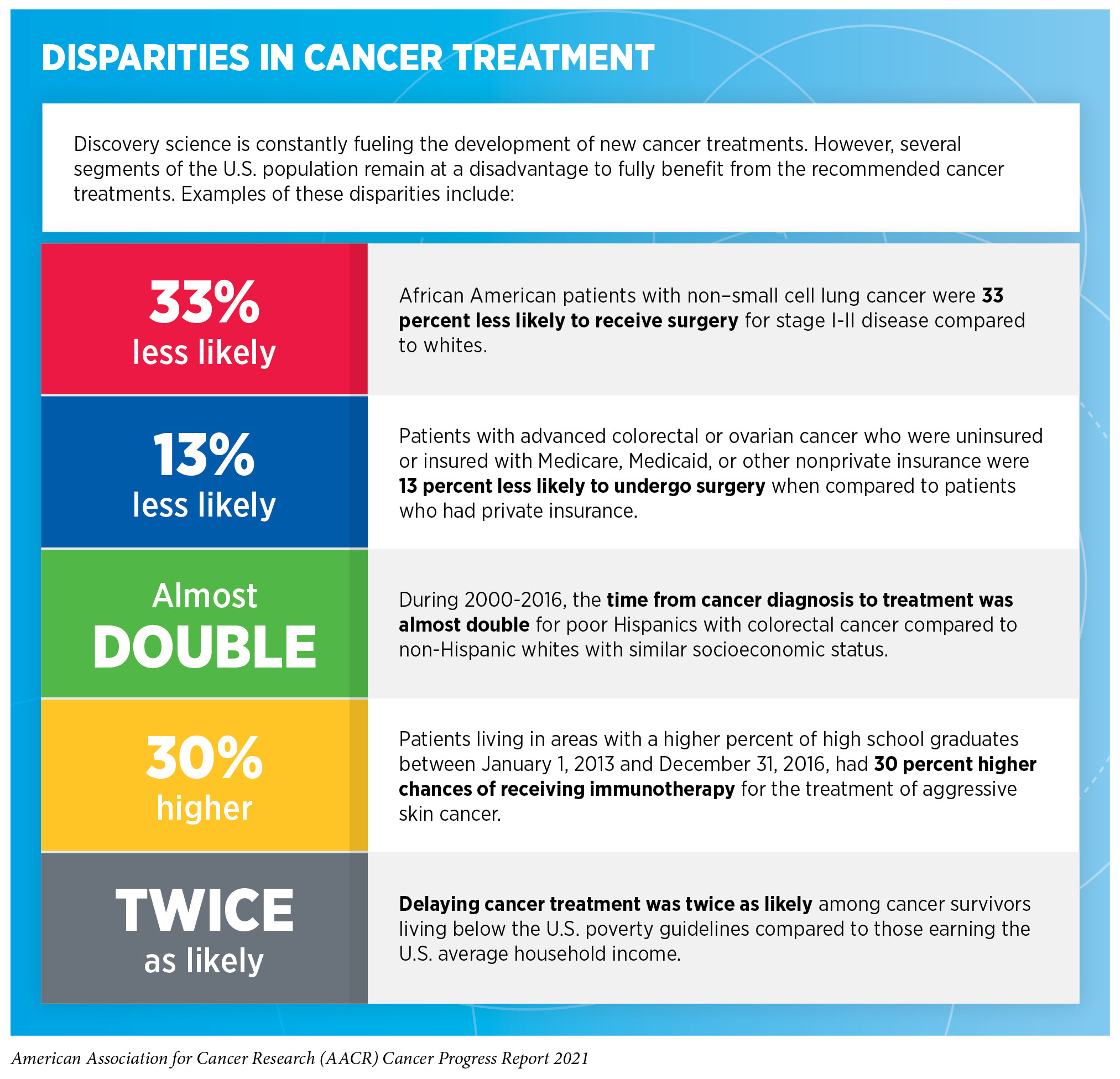 As we make strides toward effectively treating cancer, it is also important to note that not all patients receive and/or benefit from the care recommended for the type and stage of cancer for which they have been diagnosed. Gaps in equitable and affordable access to cancer treatment for patients from all walks of life can result in adverse survival rates that disproportionately affect certain population groups (sidebar on Disparities in Cancer Treatment). It is essential for stakeholders across the cancer research continuum to urgently and collectively address these disparities if the vision of equitable cancer care is to be realized.