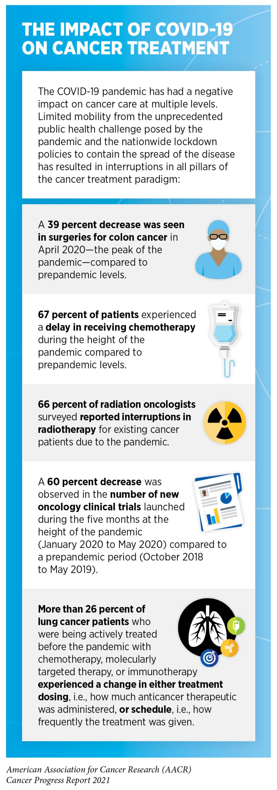 In addition to the existing challenges in the delivery of cancer treatment, the COVID-19 pandemic has created some unique barriers for patients during the past two years. The setbacks from the COVID-19 pandemic on screening rates for various cancer types are likely to have long-term effects on late-stage cancer diagnosis and outcomes for patients. In terms of treatment, cancer patients have experienced serious interruptions across all five pillars of the cancer treatment paradigm, for example, cancellations of anticancer therapies that can only be administered in a medical facility (see sidebar on The Impact of COVID-19 on Cancer Treatment). COVID-19 has also highlighted areas where lessons learned from the pandemic can help revise cancer treatment and care strategies to improve the lives of cancer patients. For example, the pandemic has spurred a shift toward telehealth, which is the distribution of health-related services from health care providers to patients using telecommunication technologies (407)Gajarawala SN, Pelkowski JN. Telehealth Benefits and Barriers. J Nurse Pract. 2021;17(2).. Another effect of the pandemic on cancer care is the rethinking of when and how anticancer therapeutics are administered. Over the past year, FDA has taken several steps that can reduce the number of times a patient must visit a health care facility for cancer treatment. For example, in April 2020, the agency approved an alternative dosing schedule for the immunotherapeutic pembrolizumab (Keytruda), which is approved for treating a wide array of cancer types (see Releasing the Brakes on the Immune System). Pembrolizumab is administered intravenously, meaning that patients must travel to a health care facility to receive the treatment. The new dosing regimen of 400 mg of pembrolizumab every six weeks provides an alternative to the standard 200 mg every three weeks. In September 2020, FDA approved azacitidine (Onureg) as maintenance therapy for patients with acute myeloid leukemia (AML) in a tablet form, making it easier for adult AML patients to manage their disease effectively without the need to visit a health care facility for the traditional intravenous administration of the drug. As a result, cancer patients have experienced, among other benefits, reduced travel, decreased social anxiety associated with hospital visits, and increased financial savings.