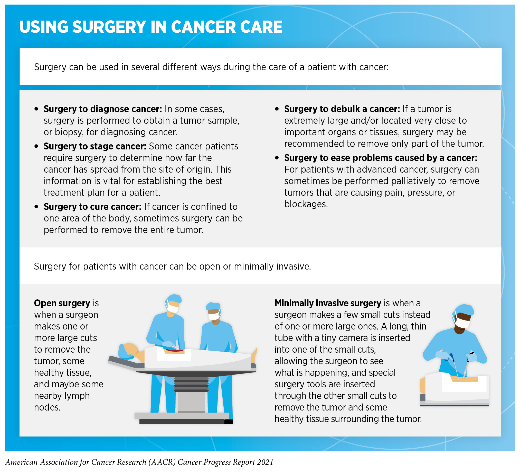 Surgery was the only available treatment for cancer for centuries (see Figure 19) and remains an important treatment option for many patients (see sidebar on Using Surgery for Cancer Treatment). A recent study shows that the global demand for surgery to treat cancer will increase by 52 percent by 2040 (413)Perera SK, Jacob S, Wilson BE, et al. Global demand for cancer surgery and an estimate of the optimal surgical and anaesthesia workforce between 2018 and 2040: a population-based modelling study. Lancet Oncol. 2021;22(2).. Researchers are continuously innovating new and improved strategies to maximize the benefit and minimize harms from surgery for cancer patients.