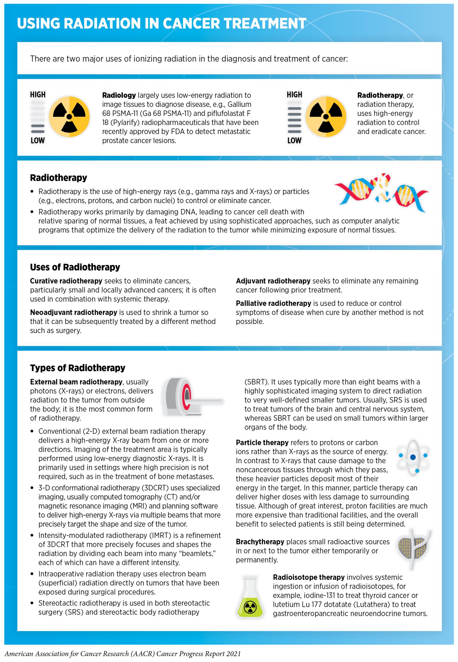 There are many types and uses of radiotherapy (see sidebar on Using Radiation in Cancer Treatment). However, it is important to note that radiotherapy may also have harmful side effects, partly because of the radiation-induced damage to healthy organs surrounding the tumor tissue. Researchers are continuously working on making radiotherapy safer and more effective and also designing novel radiotherapeutics (alone or in combination) to target more cancer types and benefit more patients. One area of rapid development is the use of AI to enhance radiotherapy and the integration of such improved approaches into clinical practice to increase efficacy and reduce toxicity from these treatments (423)El Naqa I. Prospective clinical deployment of machine learning in radiation oncology. Nat Rev Clin Oncol. Published online 2021..